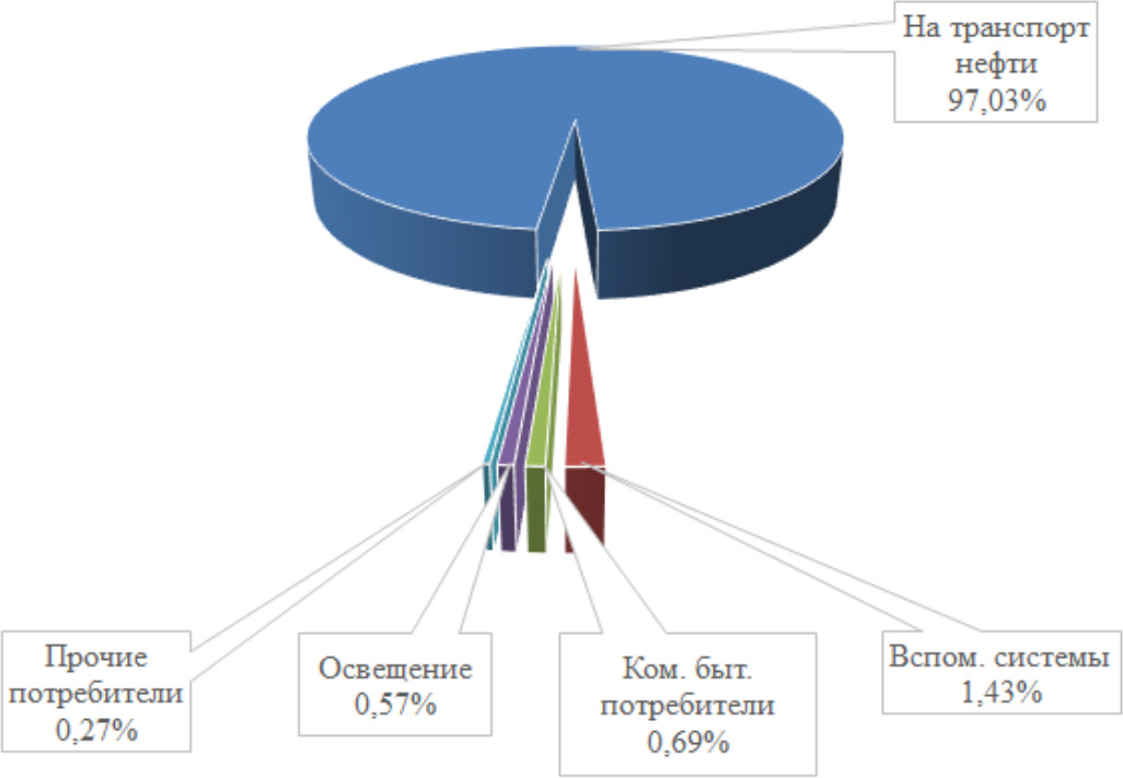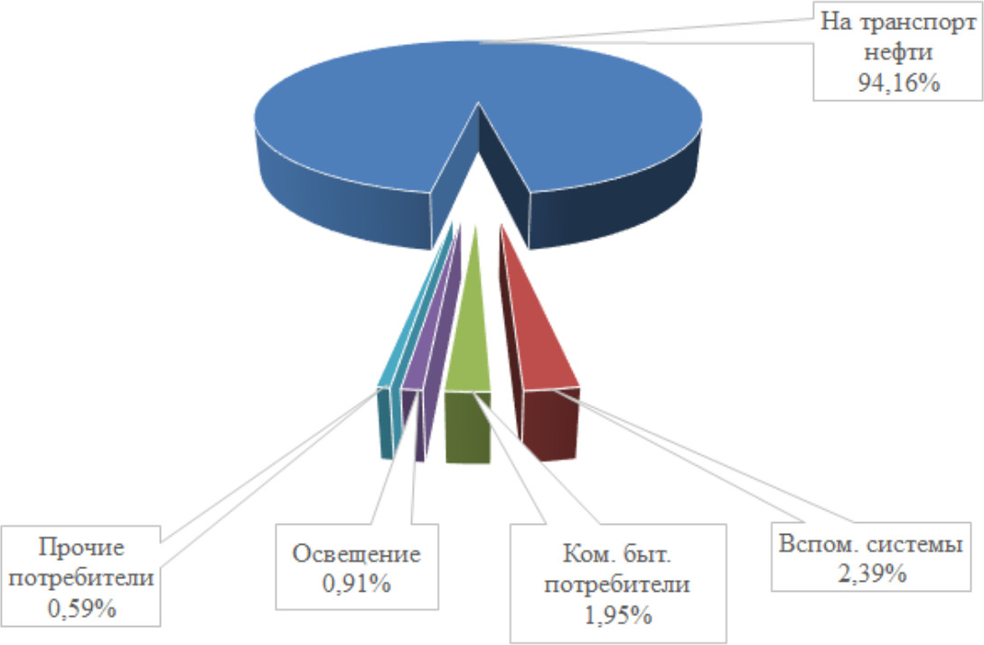 Как следует из приведенных данных, наибольший удельный вес имеет потребление электроэнергии основным оборудованием на транспорт нефти. В 2004 г. на транспорт нефти приходилось 97,03 % от общего потребления, в 2005 г. – 97,16 %, в 2006 г. – 97,17 %, в 2021 г. – 94,12 %, в 2022 г. – 92,57 %, в 2023 г. – 94,16 %. Удельный вес этой составляющей остается достаточно стабильным – изменение составляет немногим более 3 % и зависит в большей мере от загрузки магистрального нефтепровода.