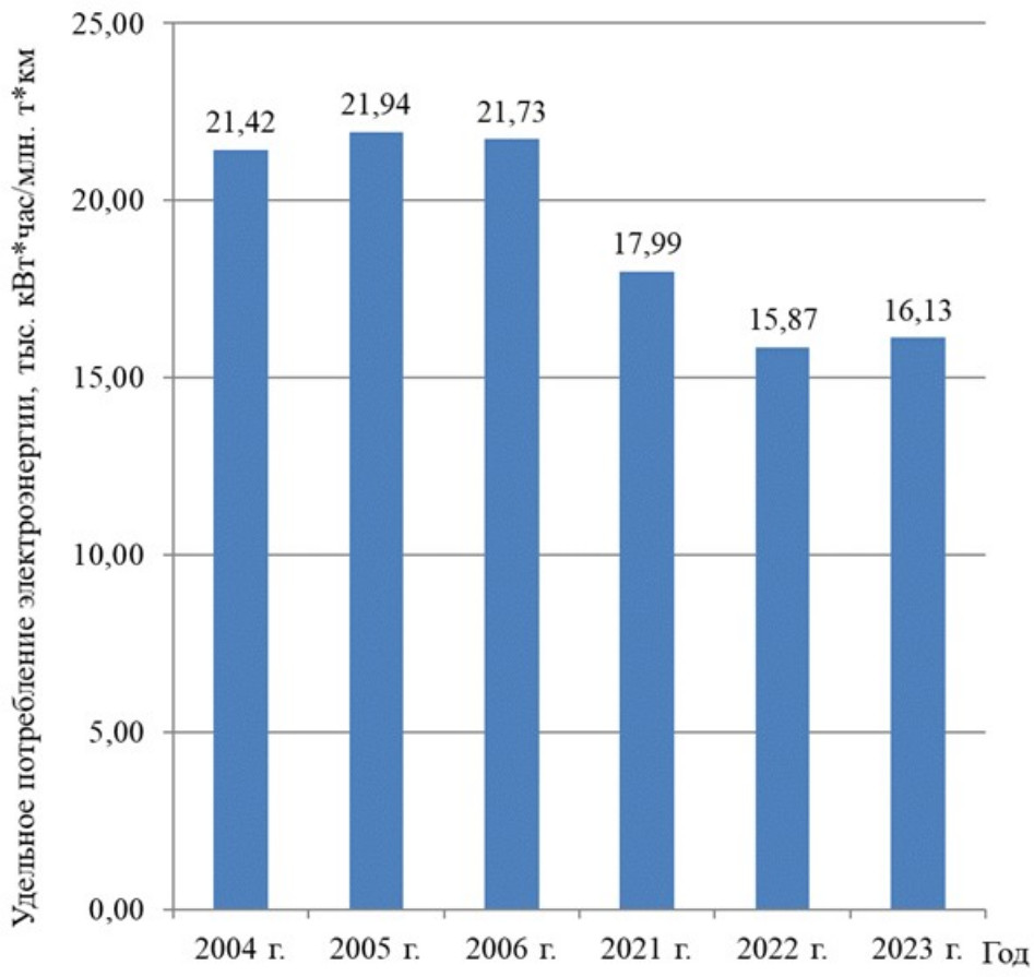 Удельное потребление электроэнергии на ТТР, Wттр, тыс. кВт×ч/млн т·км | 21,42 | 21,94 | 21,73 | 17,99 | 15,87 | 16,13 |