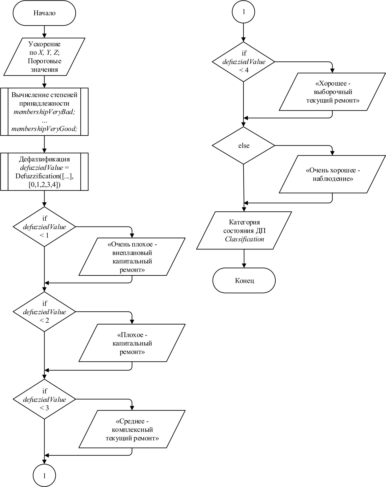 которые выполняются на основе предварительно определенных правил, что делает процесс детерминированным и быстрым. На рис. 1 представлена блок-схема алгоритма процесса классификации состояния дорожного покрытия на основе обработанных сигналов акселерометра.