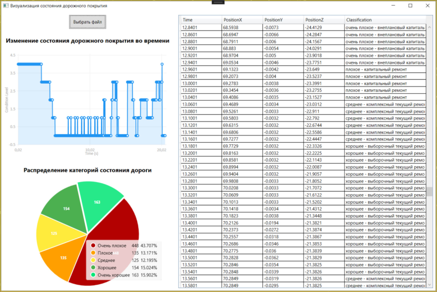 - таблица с данными, которая содержит время фиксации, местоположение ТС, классификацию дорожного покрытия и числовое значение дефаззификации, характеризующее степень повреждений дорожного покрытия.