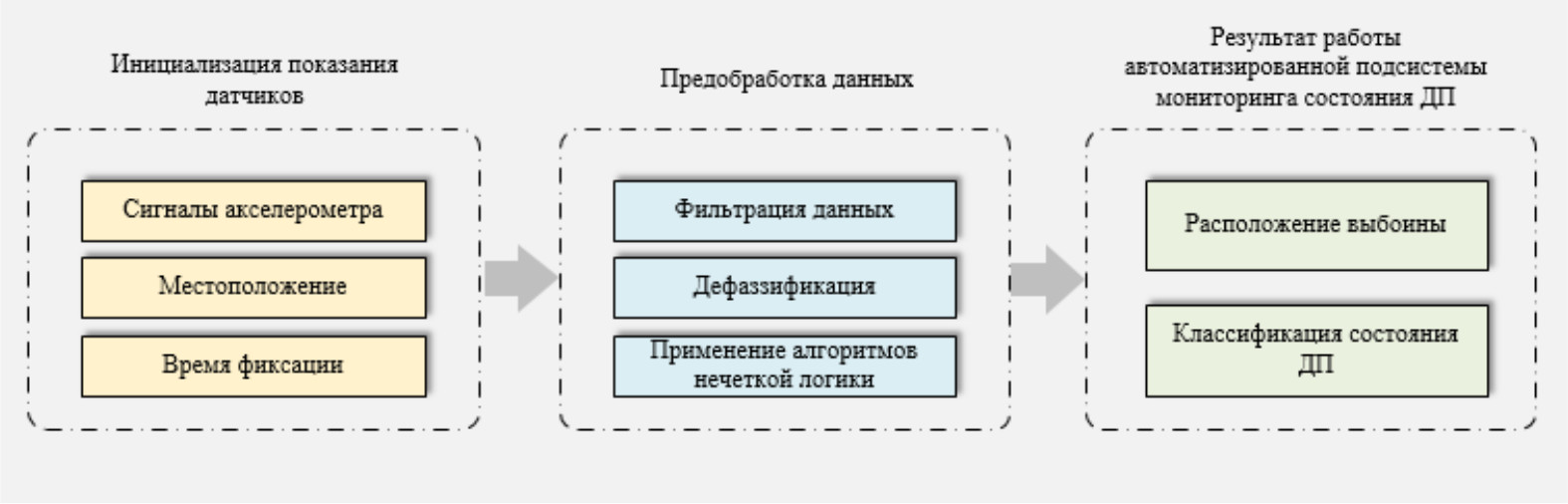 Таким образом, предлагаемый подход представляет собой не просто адаптацию существующих технологий, а оригинальную методологию комплексного мониторинга, сочетающую аппаратные, алгоритмические и аналитические компоненты в единую автоматизированную подсистему мониторинга состояния дорожного покрытия [16].