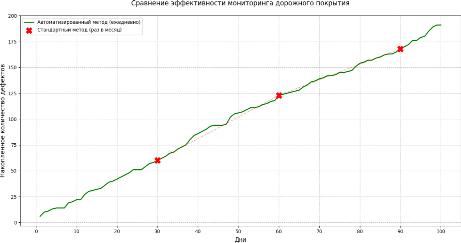 Согласно интерпретации значения по табл. 3 полученное значение относится к шкале , что указывает на то, что метод эффективен, а точность и оперативность удовлетворяют большинству требований. На рис. 7 представлен компаративный анализ эффективности автоматизированного метода ежедневного мониторинга состояния дорожного покрытия по сравнению со стандартной инспекционной практикой, проводимой один раз в месяц.
