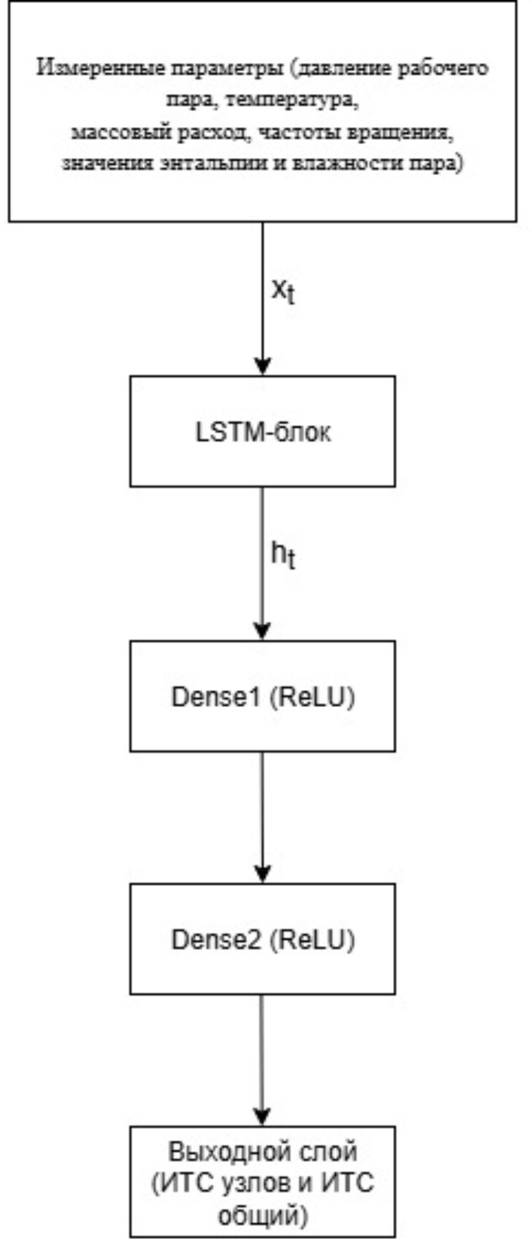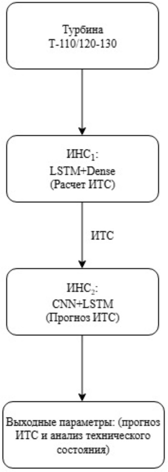 Функциональная схема представлена на рис. 1. Параметрическая диагностика паровой турбины Т-110/120-130 представляет собой многокомпонентную архитектуру, в которой изначально параметры рабочего пара (давление рабочего пара, температура, массовый расход, частоты вращения, значения энтальпии и влажности пара) поступают на вход первой нейросети, реализованной в виде гибридного LSTM-Dense конвейера. Внутри ИНС₁ рекуррентные LSTM-ячейки обеспечивают хранение и обновление долгосрочных временных зависимостей между последовательными выборками сигналов, а последующие полносвязные слои выполняют нелинейную агрегацию выделенных признаков. Такая архитектура помогает не только идентифицировать скрытые усталостные и коррозионные дефекты, но и рассчитать ИТС. Полученный в ИНС₁ вектор ИТС, отражающий совокупный уровень деградации узловых элементов, передается вместе с исходным массивом измеренных параметров на вход второй нейросети (ИНС₂), в которой пространственно-временная обработка осуществляется через последовательность сверточных блоков для локального выделения аномальных паттернов в частотной и амплитудной характеристиках, после чего рекуррентный LSTM-модуль агрегирует полученные локальные признаки в глобальное представление временного тренда. Финальный полносвязный выходной слой ИНС₂ генерирует прогноз динамики ИТС, давая возможность определить ключевые рабочие характеристики турбины на заданный горизонт времени. Модель обеспечивает не только диагностику текущего состояния, но и предикцию вероятности отказа и оценки остаточного ресурса и позволяет энергопредприятиям планировать профилактическое обслуживание с учетом фактического состояния оборудования и снижать риски внеплановых простоев.