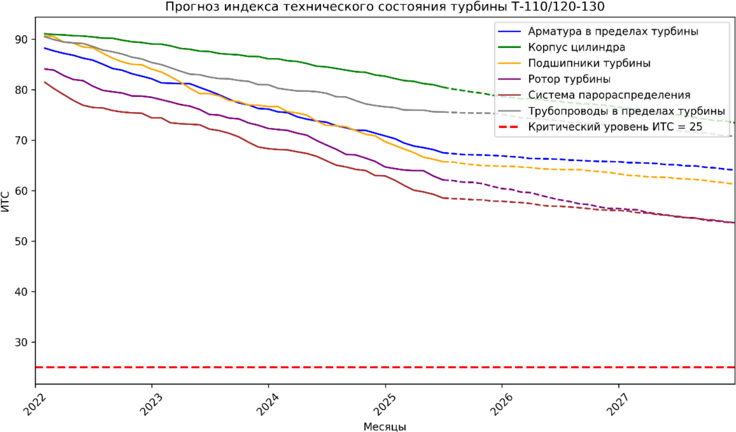 График изменения индекса технического состояния (рис. 4) демонстрирует во времени обобщенную характеристику текущего состояния оборудования турбины Т-110/120-130. По вертикали отложено значение ИТС (обычно в шкале от 0 до 100), по горизонтали – время эксплуатации. На графике видны раздельные кривые, соответствующие основным функциональным узлам – арматуре, корпусу цилиндра, подшипникам, ротору, системе парораспределения и трубопроводам. График представляет собой выходные данные по ИТС для двух нейронных сетей. На основе данных о работе турбины получены значения ИТС по параметрам турбины. Точность работы программы будет проверена с помощью методики RMSE. Абсолютных «регламентированных» порогов RMSE для задач прогнозирования технического состояния оборудования нет – RMSE всегда интерпретируется относительно масштаба целевой переменной. Рассчитанный прогноз на d дней дал предсказания: