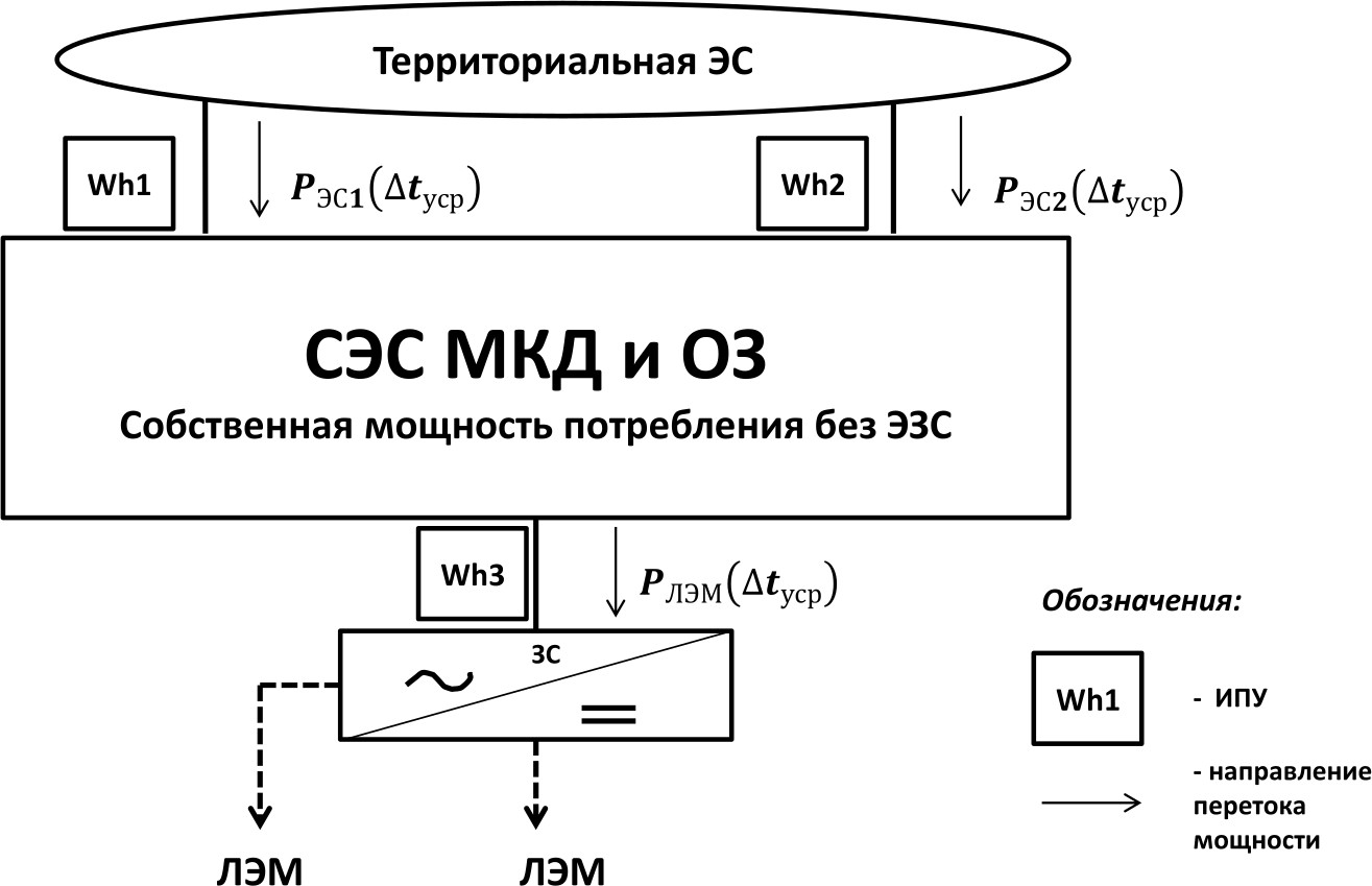 где , , – соответственно измеренные ИПУ среднеинтервальные мощности нагрузки СЭС без ЭЗС, перетока из ЭС и потребления ЛЭМ.