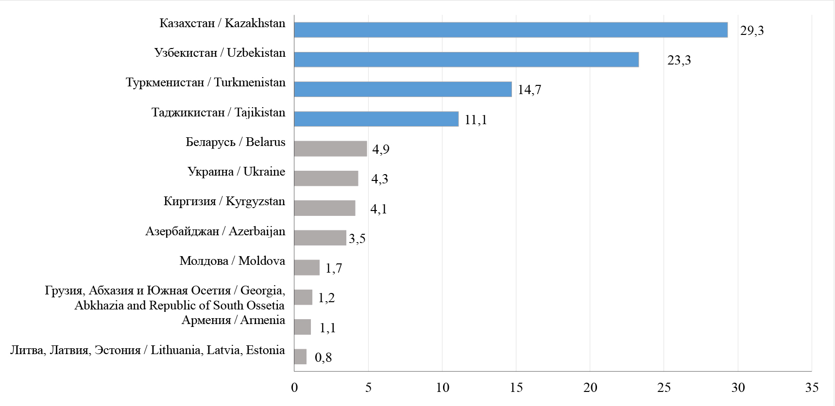 Рис. 4. Структура иностранных студентов из стран СНГ и Балтии, Грузии, Абхазии и Южной Осетии, обучающихся по программам бакалавриата, специалитета, магистратуры в России в 2021–2022 учебном году, %