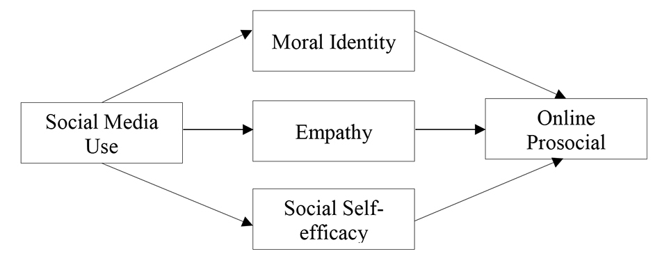 Referring to the existing theoretical base, it is very important to instil online prosocial behaviour in school teenagers. Social media use is an important factor that shapes online prosocial behaviour. Apart from that, this study model also believes that there is an indirect influence of social media use on online prosocial behaviour through the mediators of moral identity, empathy and social self-efficacy of school teenagers. The conceptual model of this study is shown in Figure 1.