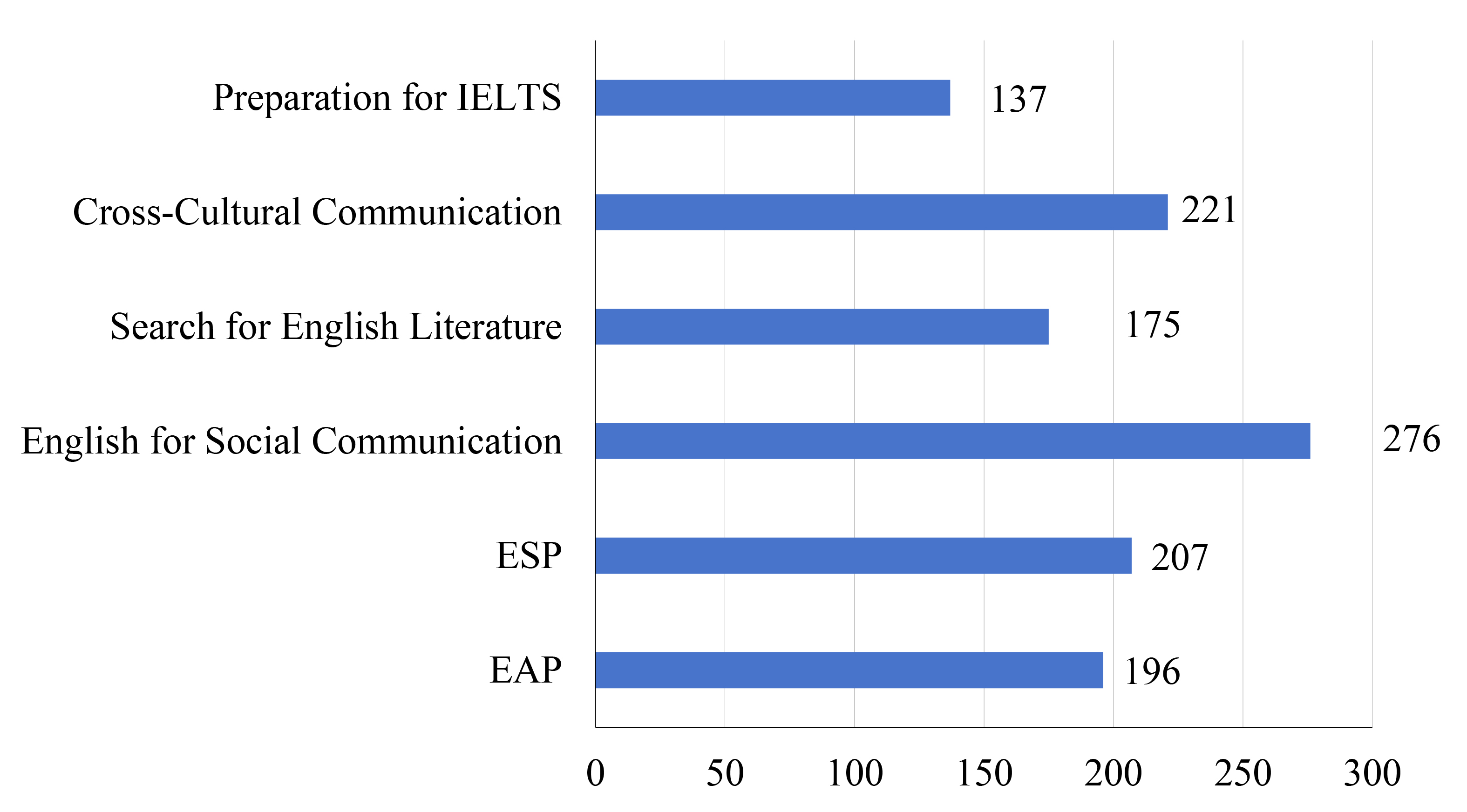 As shown in figure 2, there are 276 positive answers to the competence of English for social communication, ranking the number 1 prioritized study need of respondents. Sequentially, from number 2 to 6, the study needs are the competencies of cross-cultural communication with 221 positive answers, ESP 207, EAP 196, search for English literature 175, and preparation for international English exams 137. Except for preparation for international English exams with 137 positive answers, the rest competencies attract student over 50% of the total number of participants. The reason for such a result is that with an increasing number of international students of English-taught undergraduate programs in Civil Engineering, Mechanical Engineering, Chemical Engineering, Software Engineering, Telecommunications, and Architecture, Chinese undergraduates were exposed to cross-cultural communicative occasions with international in laboratories, library, canteens, and events. The study needs for these specific English language competencies emerge automatically.