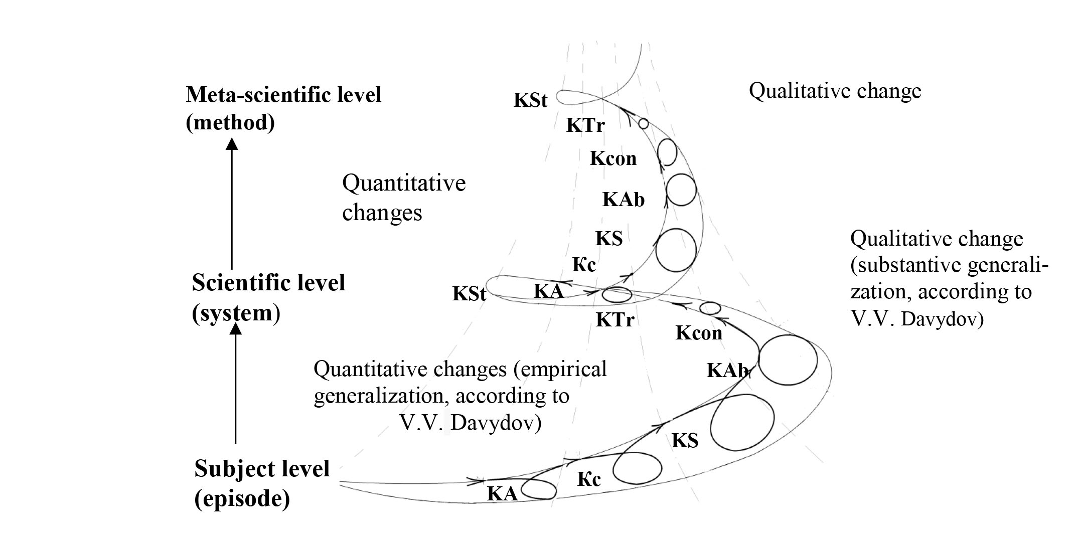 В витках спирали познания предложенной нами модели (рис. 2) наблюдается преемственность идеям С. И. Гессена31. Нижний виток модели содержит эволюционный ряд знаний предметного уровня (эпизод), виток над ним – знаний науки (системы), выше – виток знаний метанауки (метода).
