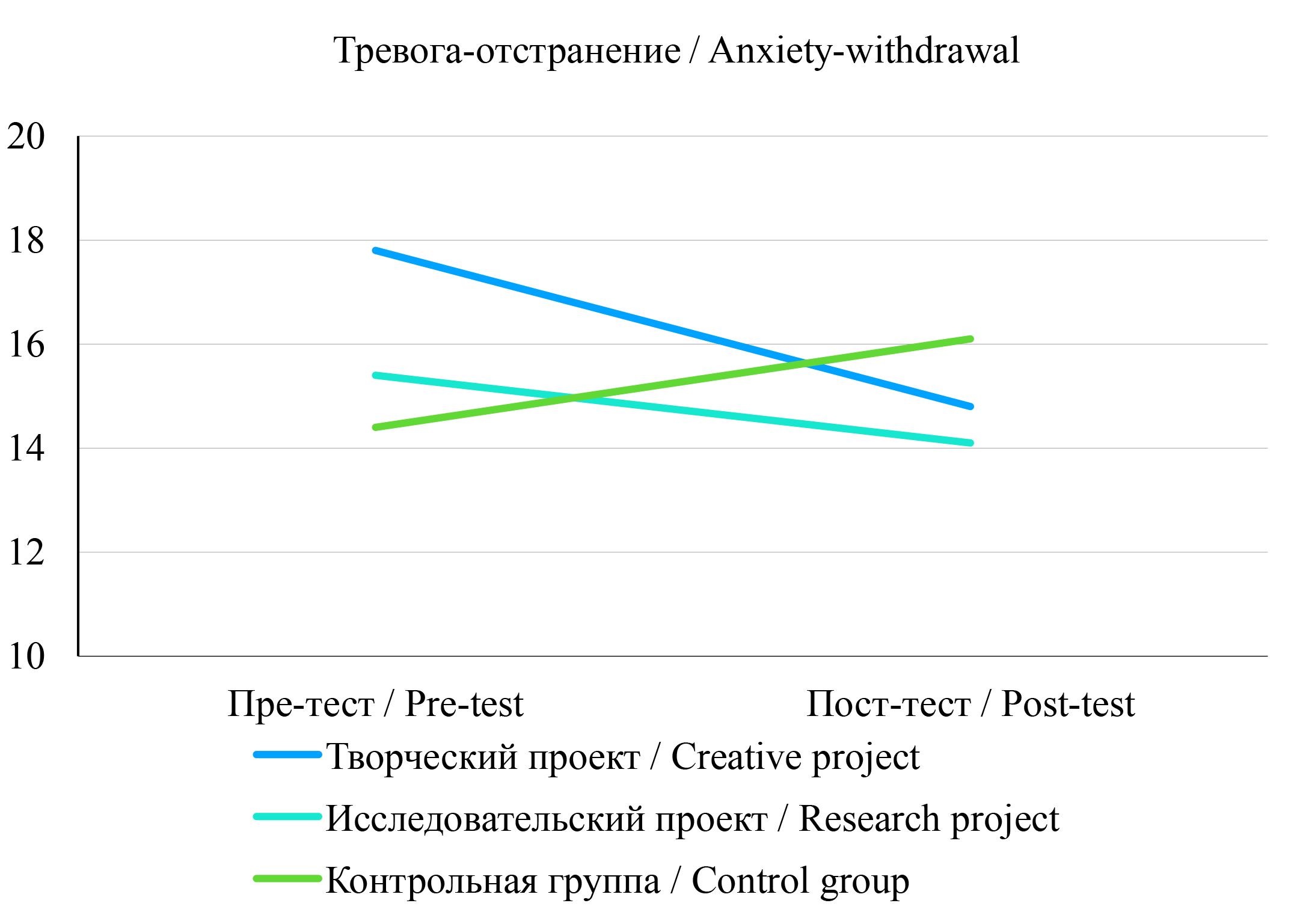 Materials and Methods. 82 children aged 5–6 years participated in the study. For the initial assessment of socio-emotional development, the Russian version of the “Test of Emotion Comprehension” and the questionnaire for teachers “SCBE-30” (including the subscales “Social competence”, “Anxiety-withdrawal”, and “Anger-aggression”) were used. The NEPSY-II subtests were used to assess executive functions as a control variable. The participants were randomly distributed to the three groups: Research project group, Creative project group, and the Control group. 22 sessions were organized with the experimental conditions, and after completing the sessions, a post-test similar to the initial assessment was performed.