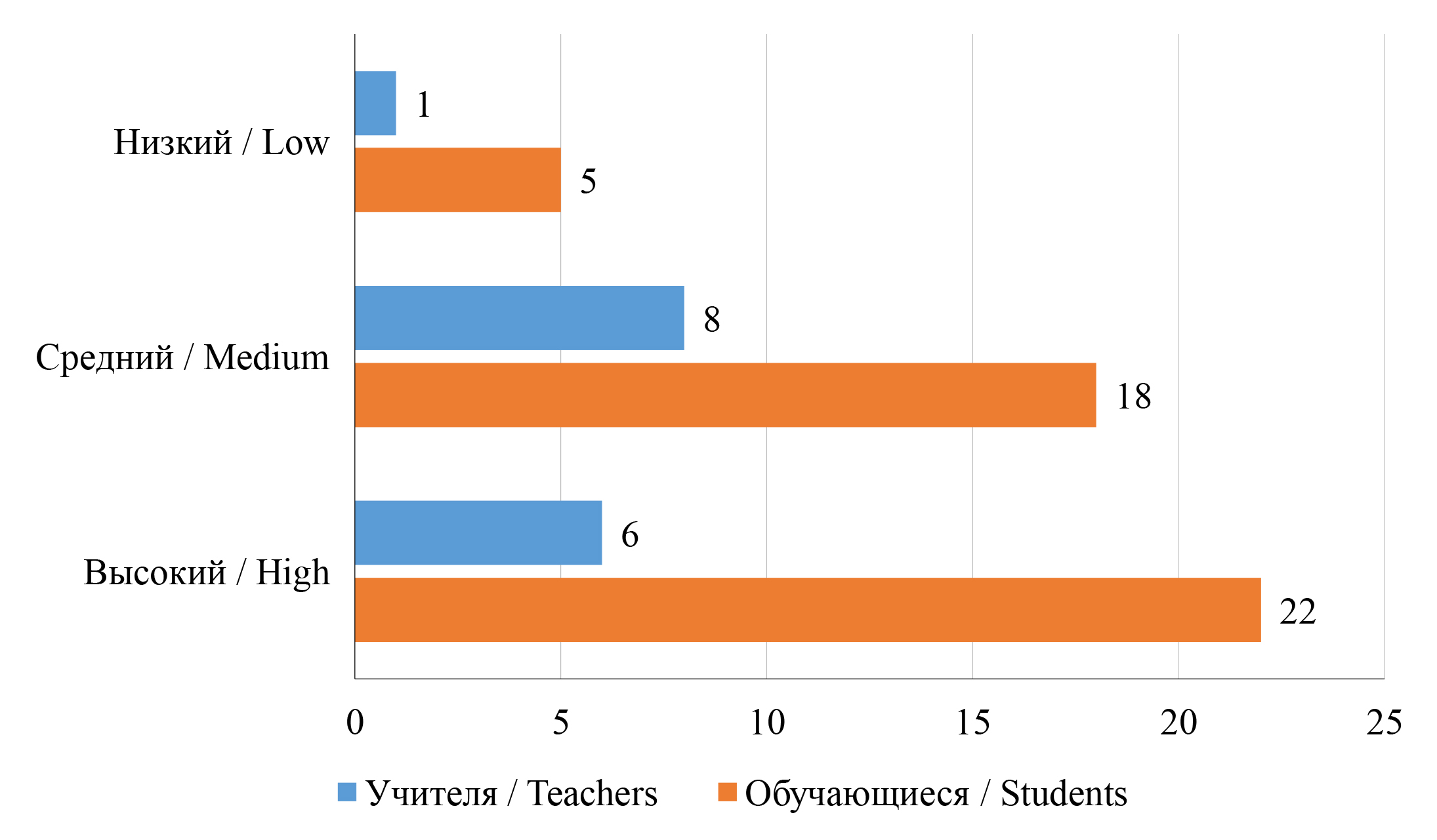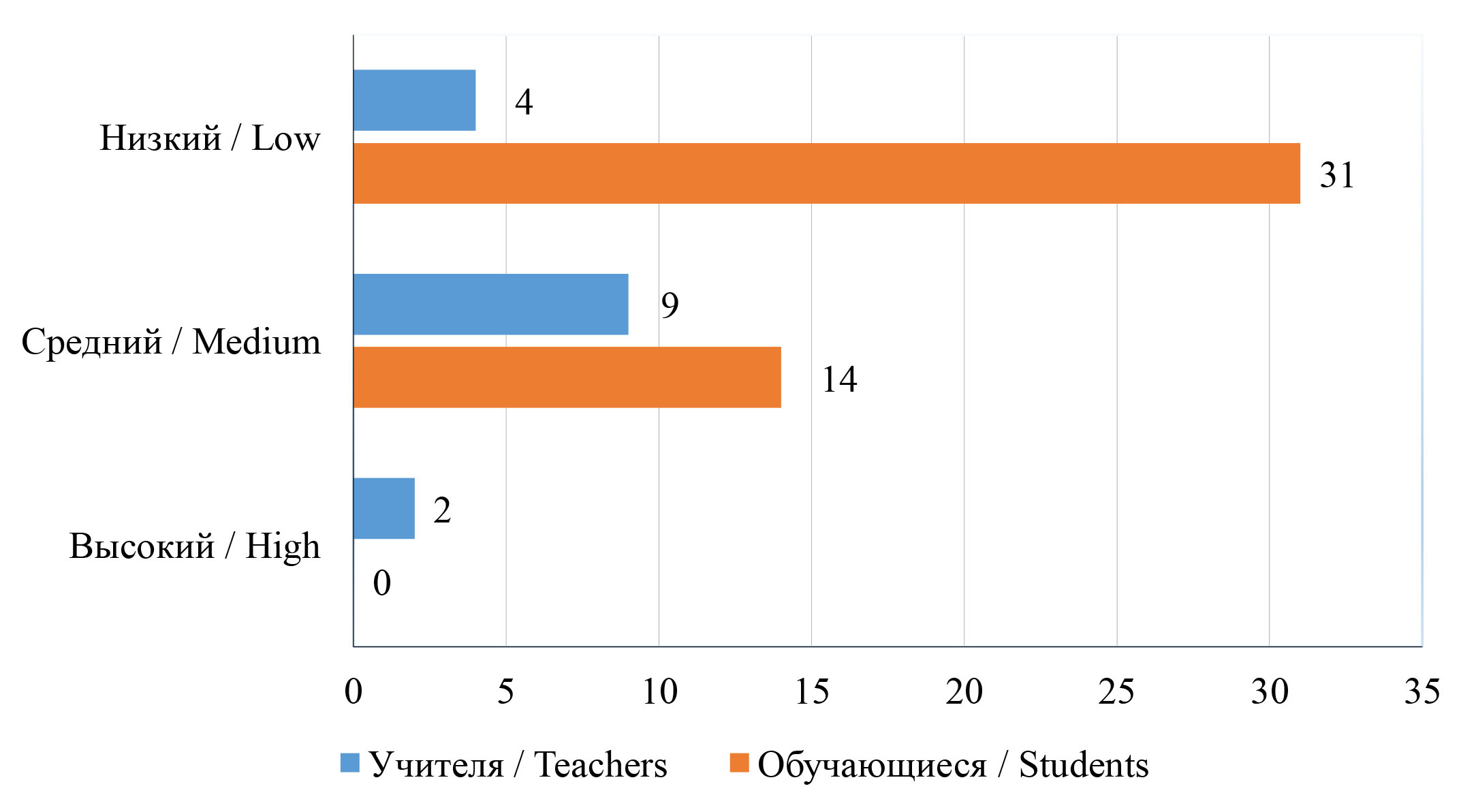 Полученные данные свидетельствуют о среднем уровне владения русским языком среди большинства учителей (9 чел.), при этом низкий уровень отмечается у преобладающей части обучающихся (31 чел.). Респонденты демонстрируют средний и высокий уровень мотивации к изучению русского языка – 14 учителей и 40 обучающихся заинтересованы в его освоении.