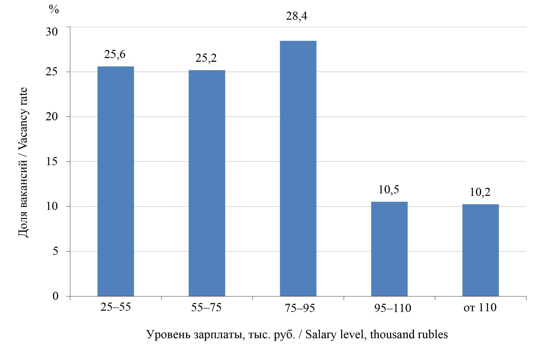 На втором этапе установлены диапазоны заработный платы вакансии специалиста по обучению и развитию. Для этого использована рекрутинговая платформа «HeadHunter»13, ранжирующая вакансии по диапазонам предлагаемой заработной платы. Данная платформа демонстрирует более 1 тыс. запросов работодателей относительно навыков специалиста по обучению и развитию среди актуальных вакансий в открытых базах, однако заработная плата указана в 64 % открытых вакансий представленной выборки.