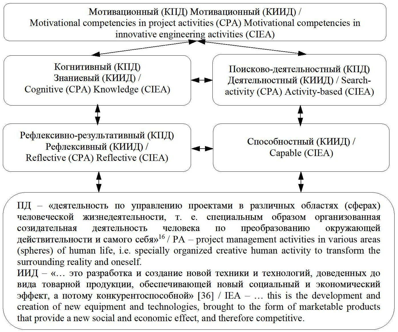 Проектная деятельность может быть как отдельным этапом ИИД, так и самостоятельным видом деятельности (инновационной проектной деятельностью), если ее результат продаваем (техническая документация, изделие и др.)14. Сравнительный анализ структуры компетенций в этих видах деятельности (рис. 1) также говорит об их идентичности, несмотря на некоторые отличия в названии трех компонентов (знаниевый – когнитивный, поисково-деятельностный – деятельностный, рефлексивно-результативный – рефлексивный) и отсутствие в явном виде в компетентности ПД способностного компонента, но включение его в содержание поисково-деятельностного15.