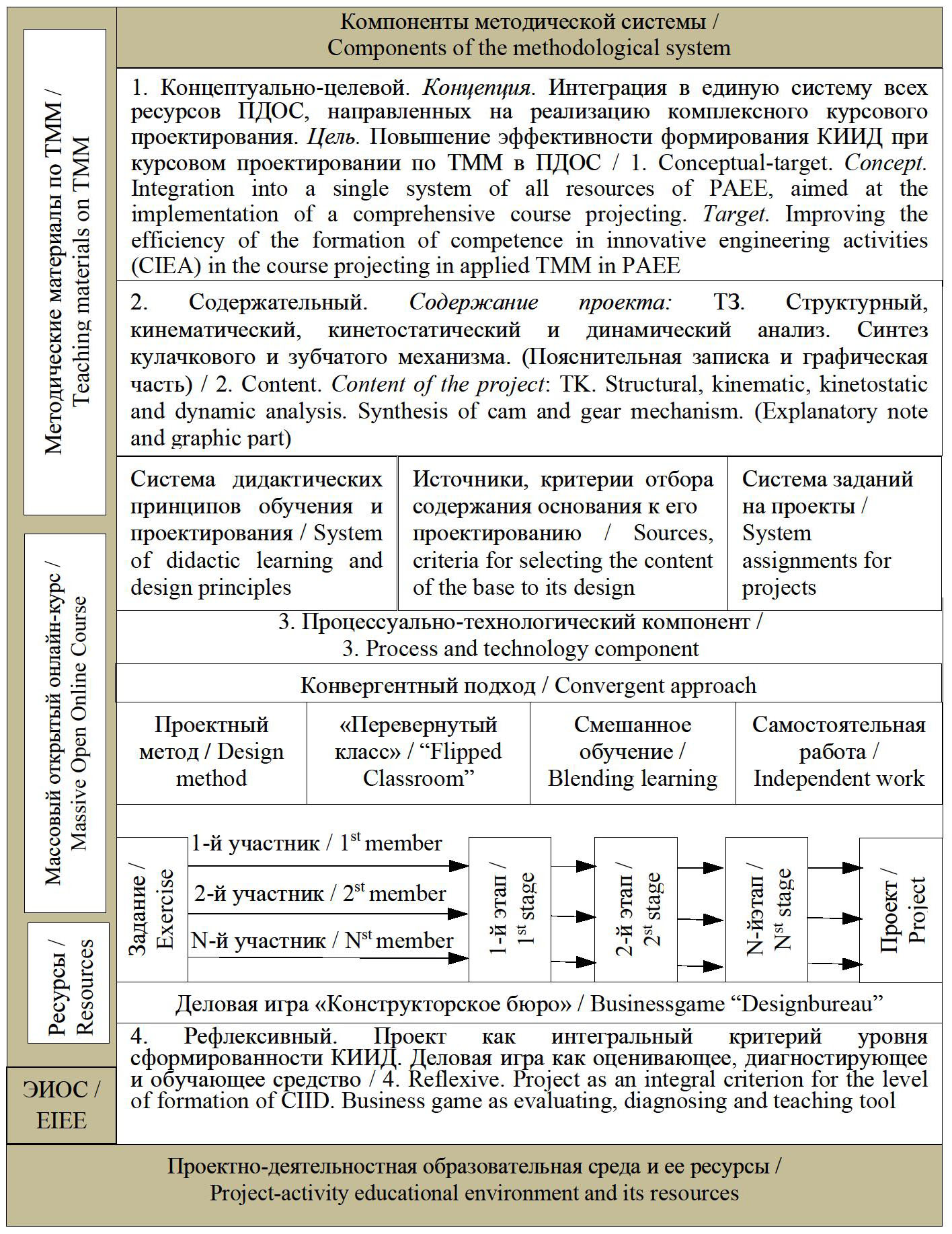 Для обучения студентов ИИД в новой образовательной среде разработана методическая система, представленная ее теоретическим обоснованием, педагогической моделью и методикой формирования КИИД при комплексном курсовом проектировании по дисциплине «Теория механизмов и машин». Модель системы построена на основе интеграции в единый комплекс всех ресурсов созданной образовательной среды: массового открытого онлайн-курса «Основы проектной деятельности», электронного учебно-методического комплекса «Теория механизмов и машин с элементами инноватики»; также включает концептуально-целевой, содержательный, процессуально-технологический и рефлексивный компоненты [3]. Процесс обучения реализовывался в форме деловой игры «Конструкторское бюро» – контролирующего, диагностирующего и организующего инновационную подготовку средства обучения.