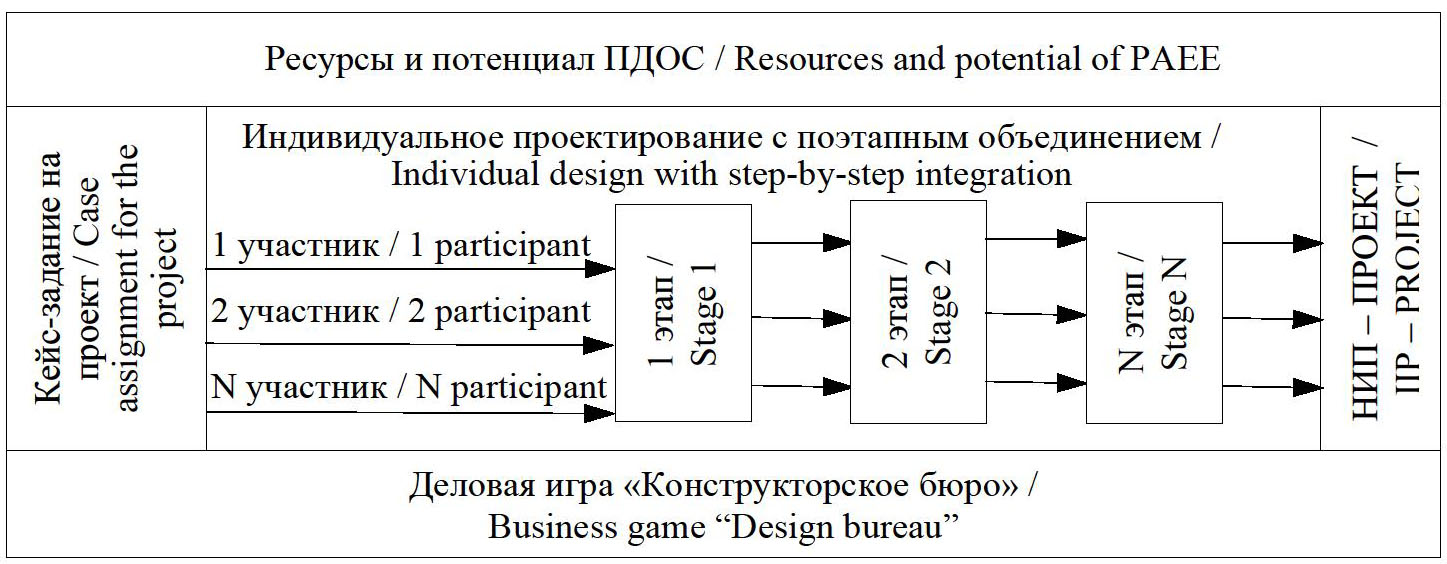 В соответствии с авторской методикой организован и проведен обучающий этап сравнительного эксперимента20. В качестве обучающего воздействия было использовано комплексное курсовое проектирование – проектирование, ориентированное на исследование единой темы по одному (при необходимости по нескольким) объекту рабочей программы дисциплины, выполняемое группой студентов (2–6 чел.), обучающихся по одной или различным образовательным программам, с целью формирования навыков проектно-исследовательской деятельности в избранной профессиональной области, а также принятия самостоятельных решений, а ее защита направлена на интегральную проверку сформированности требуемых компетенций21. Такое проектирование в качестве экспериментального реализуется в университете на протяжении последних трех лет.