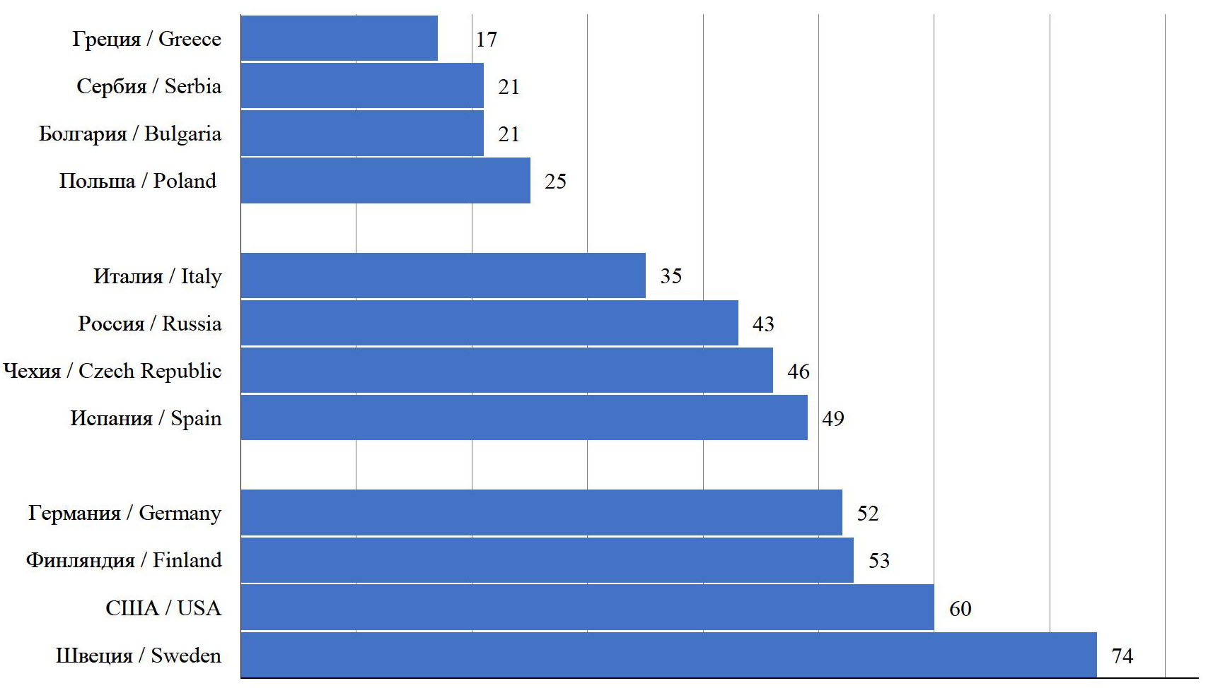 Развитость институтов образования взрослых обусловлена вовлеченностью населения в процессы непрерывного обучения, интенсивностью, масштабом образовательных практик и свидетельствует о сформированности институциональной среды. Анализ международных статистических данных показывает, что страны существенно различаются по уровню участия взрослых в образовательных практиках: имеются страны-лидеры, где в обучение включены более 50 % взрослого населения, страны со средним и низким уровнем участия взрослых в обучении (рисунок).