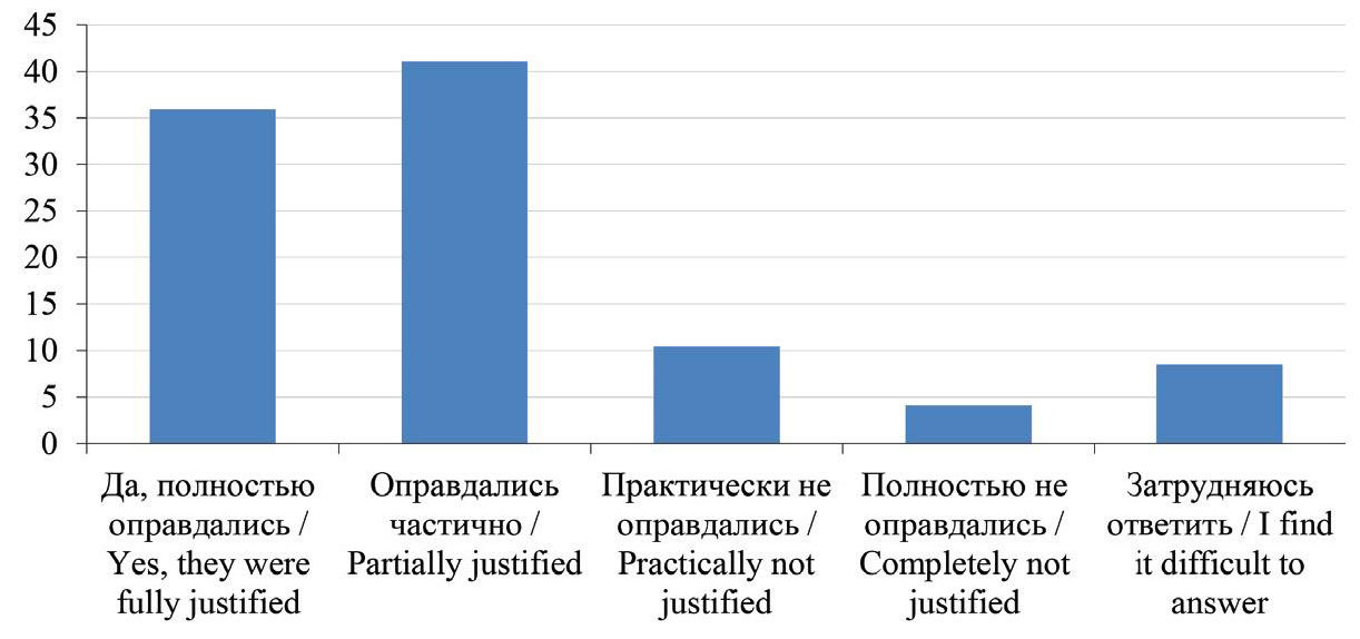 Выявленный невысокий уровень доверия студенческой молодежи к системе профессионального образования совпадает с данными проведенных в 2018 и 2019 гг. исследований Г. Е. Зборовского и П. А. Амбаровой [32; 34], что свидетельствует о сохранении ранее выявленного тренда.