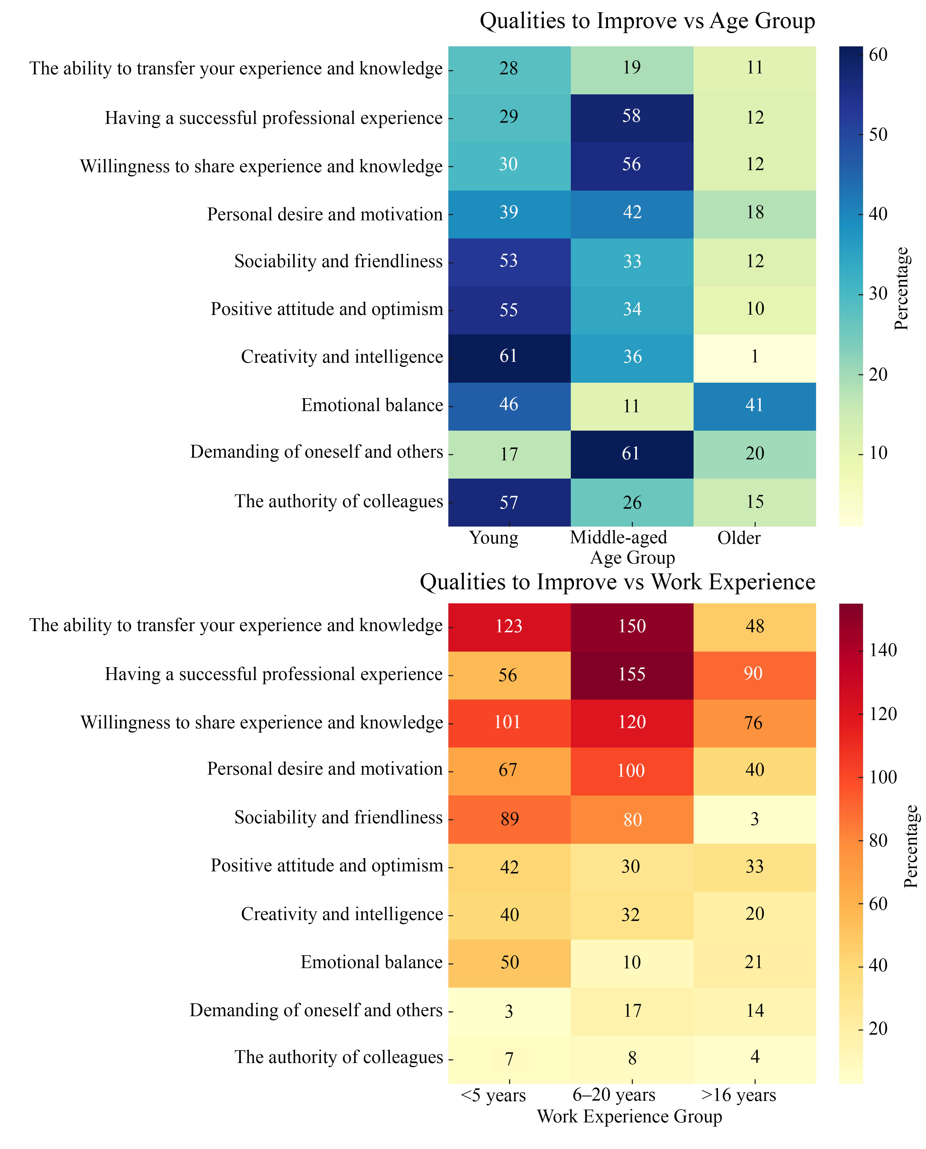 These visualizations will provide insights into the relationship between “Age”, “Work experience” and “Qualities to improve” (Figure). Visualization of the results was carried out using Python with Matplotlib, a step-by-step plan for performing the analysis is specified in the support materials (Appendix 2). The intensity of the color of the cells reflects the number of respondents belonging to a particular age group or work experience category who selected the corresponding option.