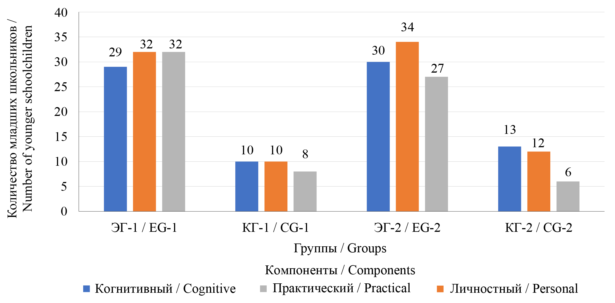 Участники исследования были разделены на экспериментальную (ЭГ) и контрольную (КГ) группы: ЭГ-1 – 31 чел. и КГ-1 – 29 чел. (Школа № 13 г. Благовещенска), ЭГ-2 – 30 чел. и КГ-2 – 32 чел. (Информационно-технологический лицей № 24 г. Нерюнгри имени Е. А. Варшавского).
