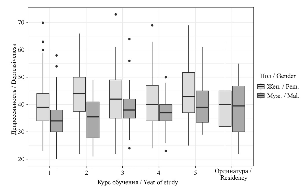 - Факторы пола и курса обучения связаны с депрессивным настроением у студентов-медиков. У юношей, по сравнению с девушками, оно выражено в меньшей степени, как и у студентов первого курса.