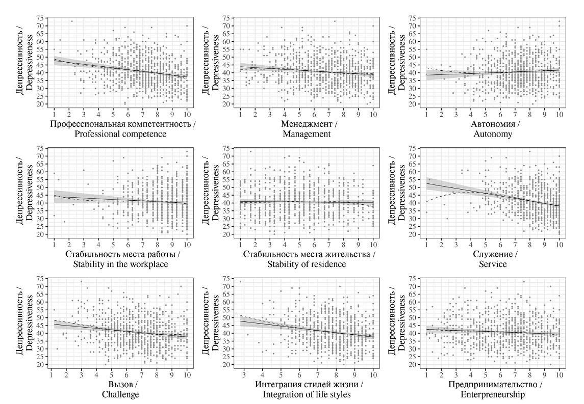 Отметим, что прямые линии регрессии на диаграммах разброса (рис. 2) характерны для обычной линейной связи. Пунктирные линии, которые видны на четырех графиках из девяти, указывают на то, что связи некоторых якорей карьеры с депрессивностью могут носить нелинейный характер. Это значит, что нужно обратиться к такому методу как обобщенные аддитивные модели.