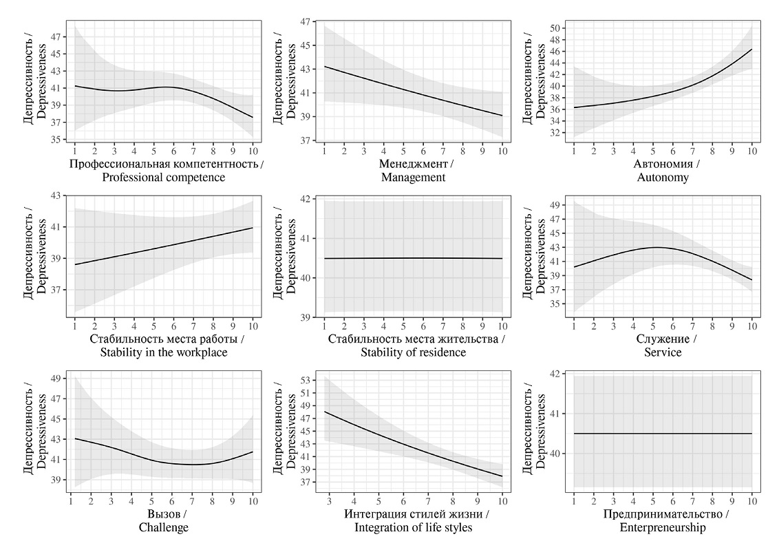 Results. Career anchors are predictors of depressed mood. Service orientation and professional competence reduce the severity of depressed mood, while the relationship is non-linear. The desire of students to integrate different areas of their lives and organize the activities of other people is negatively associated with depressed mood, but the relationship is linear. The severity of depressed mood is exacerbated by career anchoring on autonomy.