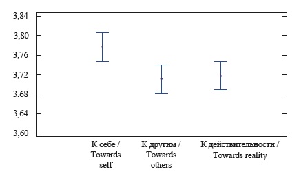 Результаты дисперсионного анализа свидетельствуют о том, что основной эффект наблюдается только для переменной «возраст». Чем старше подросток, тем в большей степени у него сформировано ценностное отношение к другим. Взаимодействие между факторами нулевое и основной эффект для фактора «пол» отсутствует. Данный результат отражает факт отсутствия значимых статистических различий между уровнем сформированности ценностного отношения к окружающему миру между мальчиками и девочками.