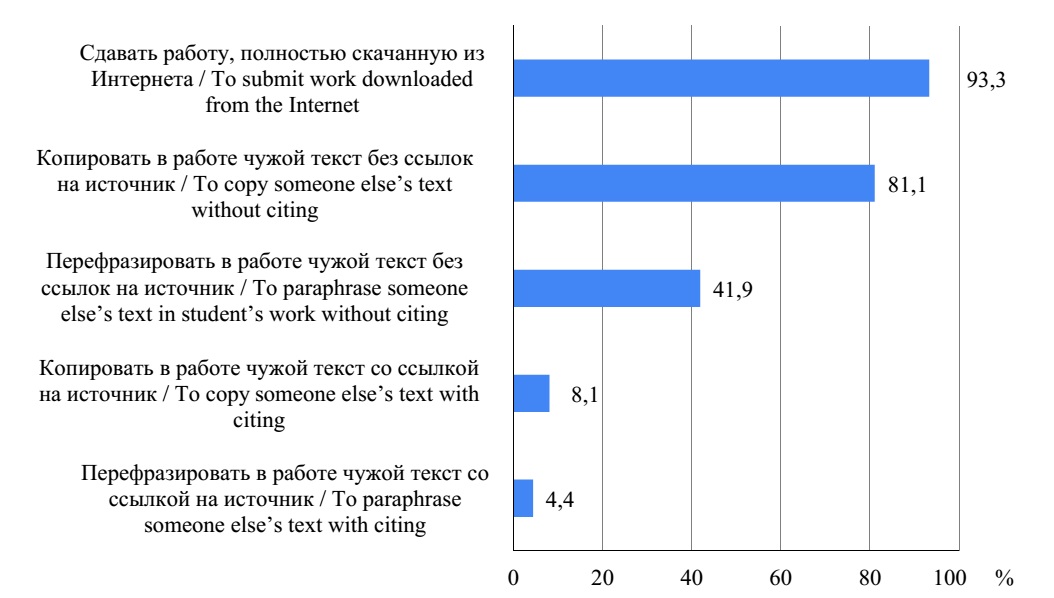 В свою очередь, некоторые ученые указывают на недостаточность знаний школьников о плагиате и их неверные представления о правилах цитирования, а также на неумение корректно оформлять заимствования из источников и делать ссылки [10; 14; 15].