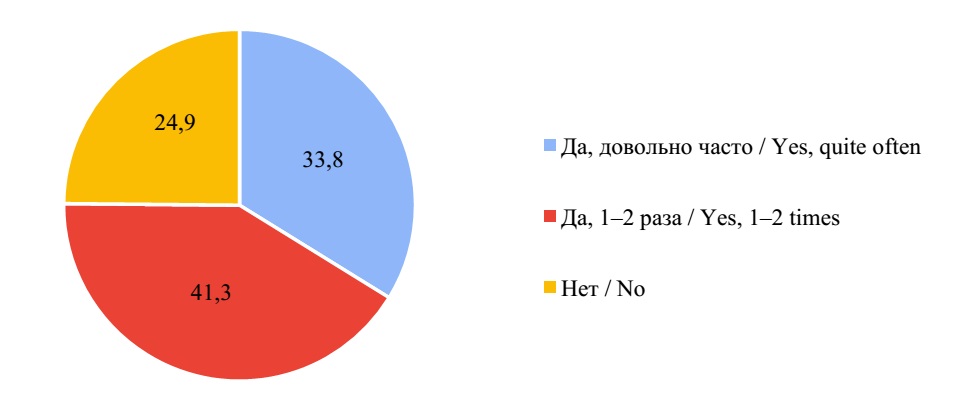 Fig. 5. Distribution of teachers’ answers to the question “Have there been cases in your practice when learners’ work mainly consisted of text copied from the Internet without any references?”, %?