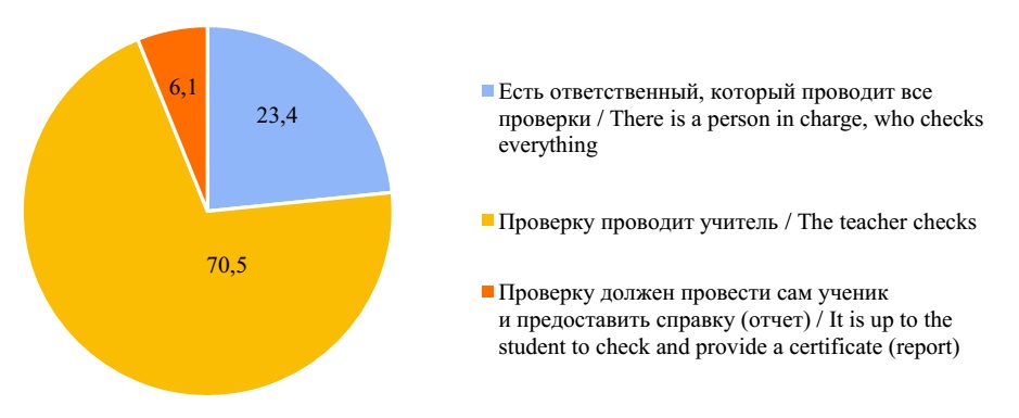 Учителям был задан вопрос «Есть ли в Вашем образовательном учреждении компьютерная проверка работ старшеклассников на наличие плагиата?», на который получены следующие ответы: 42,8 % отметили, что «обязательной проверки работ нет, но я делаю это самостоятельно», 30,8 % – выбрали вариант «нет, такие проверки не проводятся, и я лично также их не делаю», 11,4 % – указали, что «все работы старшеклассников проходят компьютерную проверку на наличие плагиата», 15 % остановились на варианте «некоторые работы проходят компьютерную проверку на наличие плагиата». Таким образом, в большинстве школ проверки либо не проводятся, либо основаны на личной инициативе отдельных учителей, т. е. носят бессистемный характер.