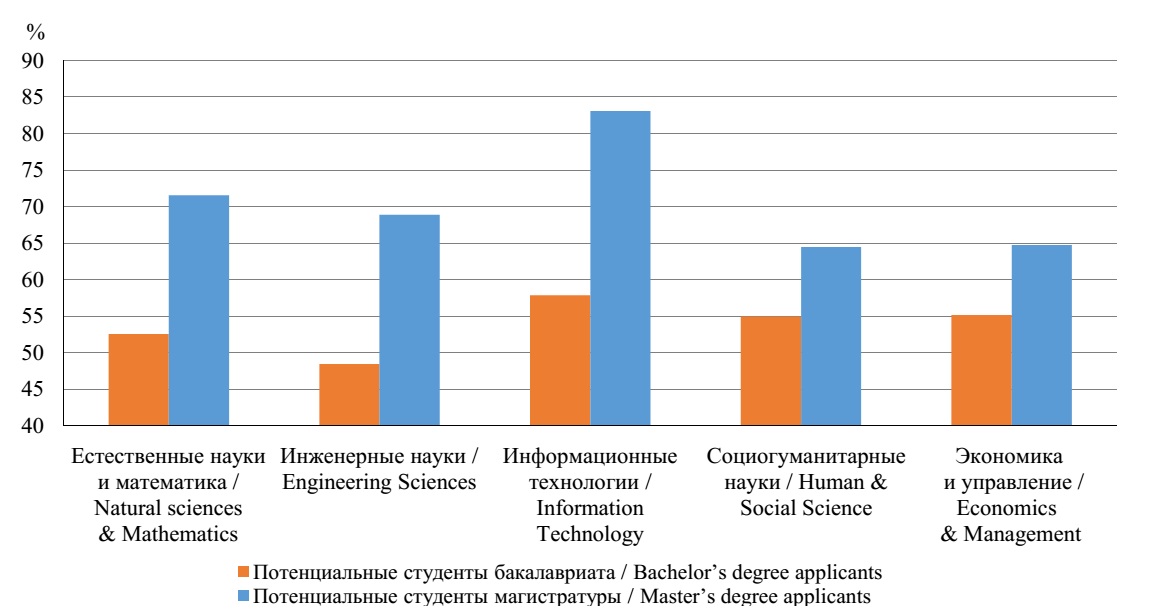 Различия выявлены по образовательным профилям9. На входе в университет наиболее восприимчивы к смешанным курсам потенциальные студенты IT-направлений (рис. 1). Получив первичный опыт, инженеры также понимают, что с точки зрения технологий смешанное образование соответствует требованиям «века цифровизации» (студент, мужчина, магистратура, инженерное направление, бюджет). Они могут стать пилотными группами для апробации университетами новых инструментов и механизмов организации смешанного обучения.