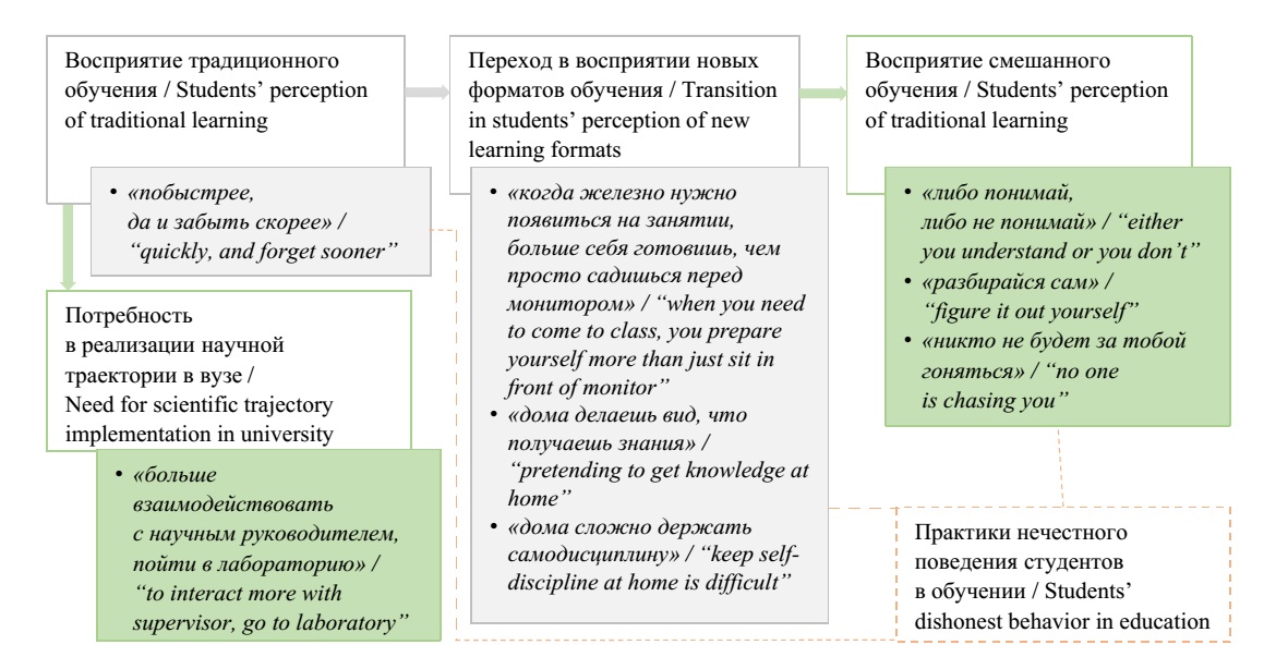 По оценкам студентов, в отношении смешанного и традиционного обучения действует «принцип зеркальности» (студент, женщина, магистратура, экономика и управление, контракт), когда недостатки одного являются преимуществами другого. Переход к онлайн- и смешанному форматам, по мнению студентов, не столько теряет в общем качестве подготовки специалистов, сколько в живом общении, которое способствует адаптации личности как к университетскому сообществу, так и к будущей работе и социальной жизни.
