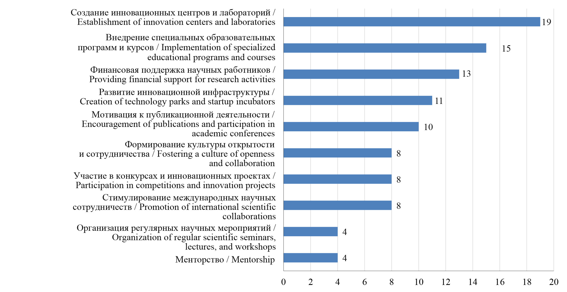 Важнейшим вектором развития реформ образования 90 % опрошенных считают участие в международных исследовательских инициативах, 23 % – стратегические партнерства с зарубежными университетами, а 10 % – программы академического обмена (магистратура, постдокторантура, стажировки). Эти данные отражают смещение внимания в сторону институциональных альянсов в ущерб классическим форматам мобильности.