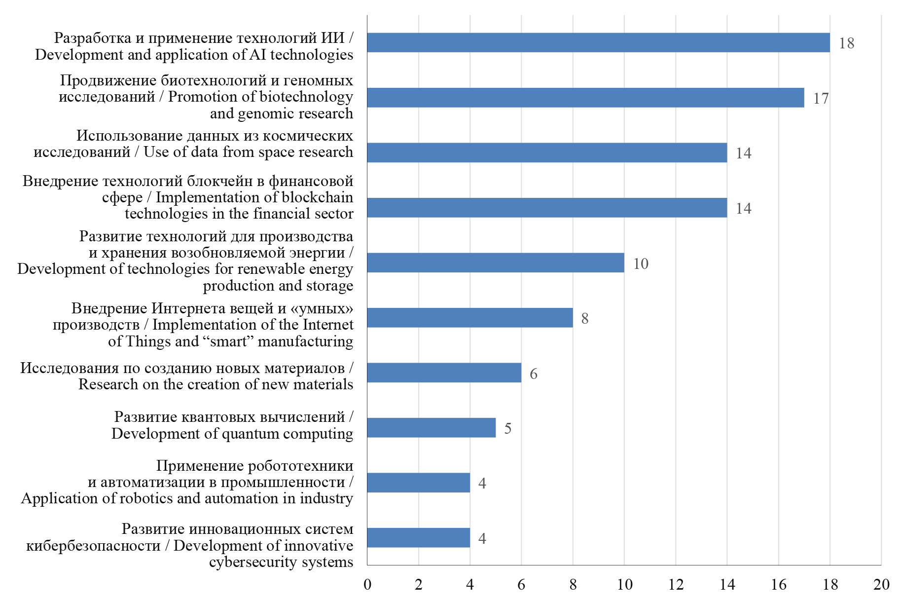Интеграция науки и образования в стратегические отрасли проявляется в интересе преподавателей к технологиям искусственного интеллекта, блокчейна, интернет-логистике и использованию космических данных, что подчеркивает ориентацию образования на национальные приоритеты развития.