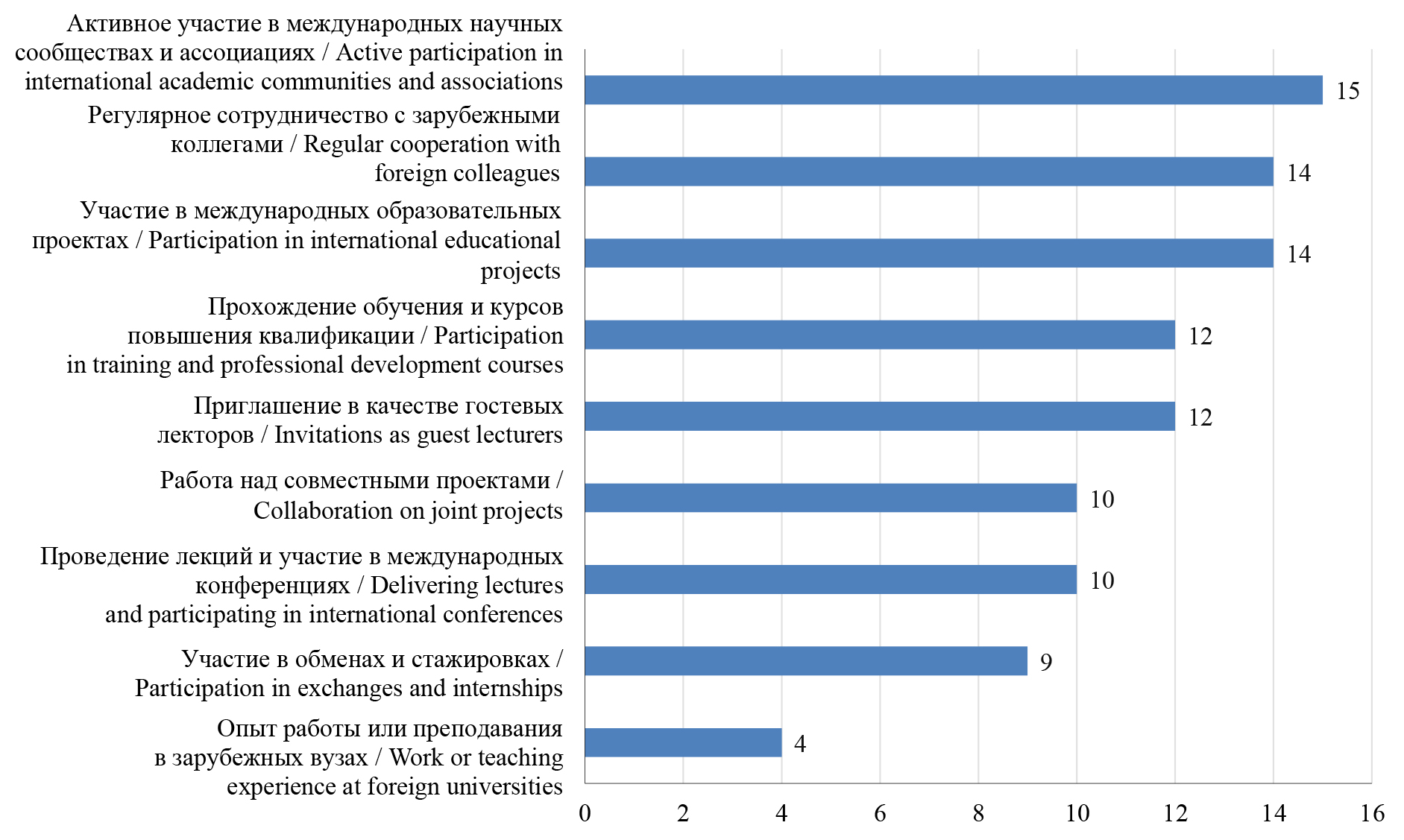 Значимыми направлениями являются активное участие в международной деятельности и обмен опытом (29 %), совместные проекты исследований и разработок (23 %), участие в международных исследовательских сетях (16 %) и академических обменах студентов и преподавателей (10 %), создание совместных образовательных программ (7 %).