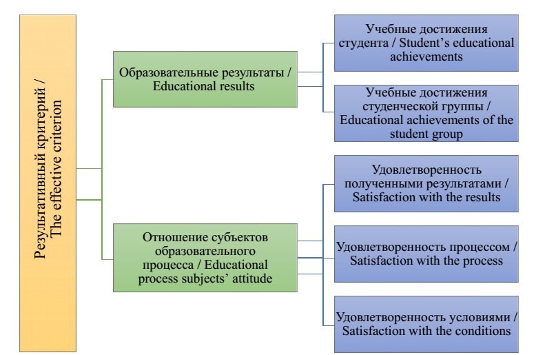 При рассмотрении СОТ как целостного средства достижения образовательной цели в ходе реализации учебной программы мы ориентировались на самое широкое понимание его эффективности, которое определяется степенью достижения поставленной цели и реализации ожиданий субъектов, а, значит, соответствует первому функциональному признаку. По этой причине первый критерий назван результативным (рис. 1).
