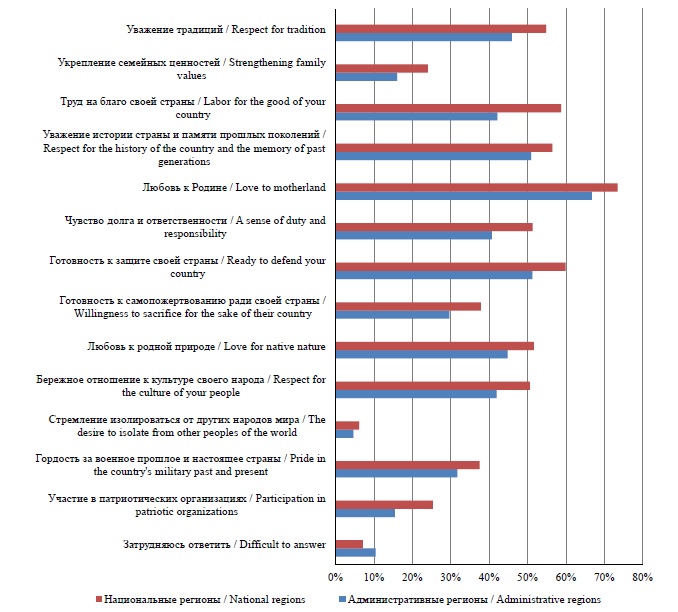 Среди школьников административных регионов шире представлен «конструктивный» патриотизм как возможность для патриота «критиковать власть своей страны» (41,2 против 29,9 %), «публично высказывать мнение, не совпадающее с точкой зрения государства» (46,1 и 42,9 %), «поддержки перемен в интересах общества» (61,8 и 57,4 %). Соответственно, быть патриотом для них значит не столько «работать и действовать для процветания страны» (40,7 %), сколько «стремиться к изменению положения дел в стране для того, чтобы обеспечить достойное будущее ее народа» (47,6 %) и «говорить о своей стране правду, какой бы горькой она ни была» (32,6 %).