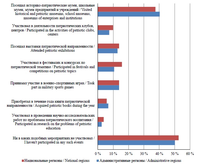 При этом школьники обоих типов регионов СФО продемонстрировали примерно одинаковые общий уровень включенности в систему патриотического воспитания (в мероприятиях патриотической направленности за последние 2 года участвовали 49,8 % опрошенных в краях и областях и 47,4 % в национальных республиках), а также степень участия в отдельных видах мероприятий (рис. 7). Учащиеся административных субъектов предпочитают в рамках патриотического воспитания посещать различного рода музеи (эту форму отметили 40,3 % опрошенных), в то время как школьники в республиках активнее участвуют в фестивалях и конкурсах по патриотической тематике (15,7 %) (рис. 7).