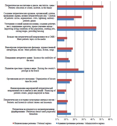 Выявленное размежевание школьников СФО по доминирующим типам патриотизма и представлениям о приоритетных агентах патриотической работы подтвердили и ответы на вопрос: что необходимо делать для формирования патриотических ценностей среди молодежи? Учащиеся республик ответили на него более традиционно, выбрав варианты «воспитание в школе, институте, семье» (52,2 %) и «создание патриотических кружков, организаций, клубов» (27,6 %). Респонденты из административных субъектов посчитали, что в современном обществе «патриотизм нельзя оторвать от комфортности и благосостояния граждан» [35, с. 24], выделив среди средств его формирования необходимость улучшения условий жизни населения (44,0 %) и поднятия престижа страны в мире (30,5 %), что согласуется с моделью «конструктивного патриотизма» (рис. 8).