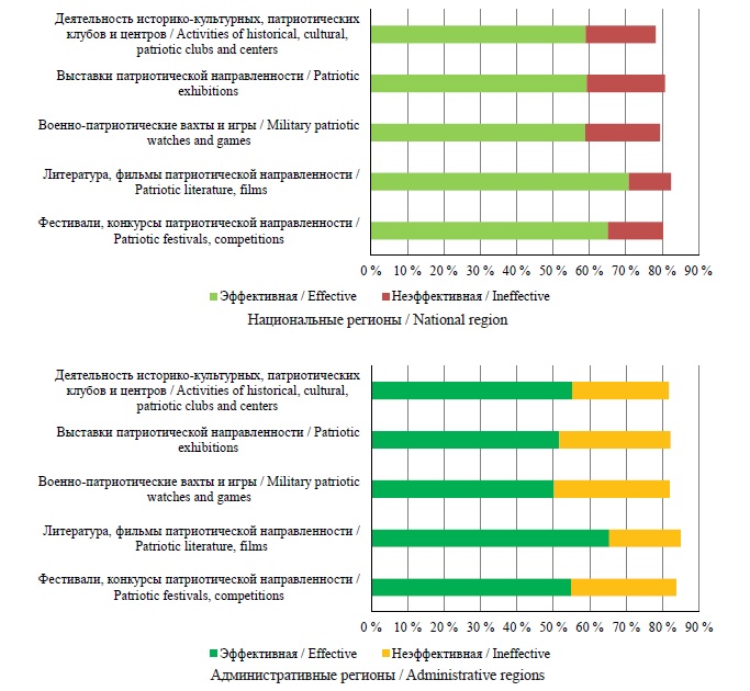 Кроме того, учащиеся национальных регионов сильнее поляризованы по степени инкорпорации в систему патриотического воспитания: вовлеченные в нее более последовательно и интенсивно включены в работу центров военно-патриотического воспитания, в связи с чем они чаще, чем респонденты из других регионов, отмечали значимую роль в патриотическом воспитании патриотических организаций (32,7 и 24,4 % соответственно) и армии (26,6 и 18,9 %), но критичнее относятся к наделению семьи данной функцией.
