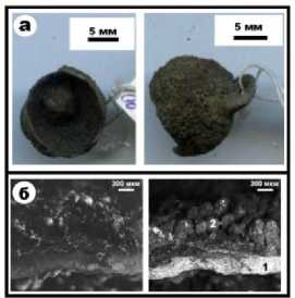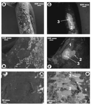 На поверхности пронизок выявлены несплошные микропленки сложного состава, но с преобладанием окисленных компонентов первичных металлических сплавов – CuO, SnO2 (табл. 2). В качестве существенных примесей к этим компонентам выступают заимствования из окружающей среды (в последовательности снижения содержаний) – SiO2, Al2O3, PbO, Sb2O3, P2O5, SO3, Fe2O3, MnO, As2O5, NiO. Средние отношения молекулярных количеств основных компонентов в этих корках: CuO : SnO2 : SiO2 : Al2O3 : Sb2O3 : PbO = 27 : 18 : 37 : 10 : 2.5 : 1. То есть в рассматриваемом случае мы имеем дело с микрокорками преимущественно глиноземисто-оксимедно-оксиоловянно-кремнеземистого состава.