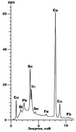 Рис. 5. ЭД-спектры конусовидных пронизок: а – бронза низкооловянистая; б – бронза высокооловянистая; в – медно-сурьмяные микровключения в бронзе.