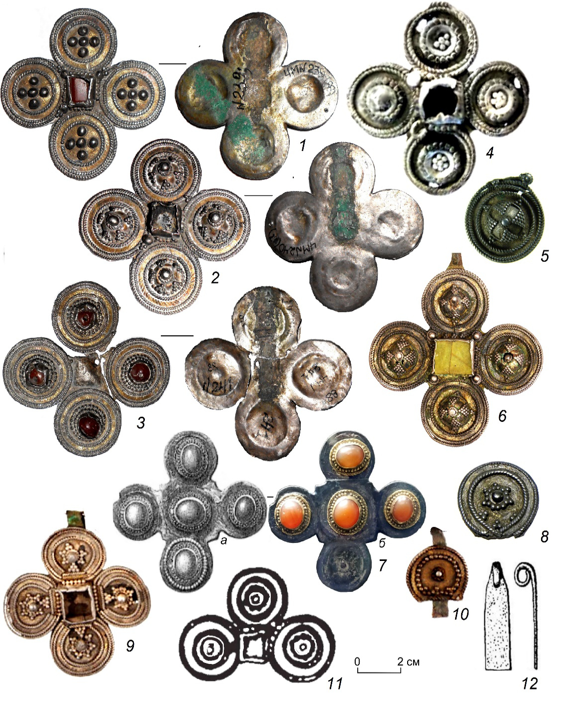 Рисунок 1. Зерно-филигранные крестовидные подвески. Фото: К.А. Руденко, из архива Ю.А. Подосеновой. Прорисовки: Р.Д. Голдина, Т.К. Ютина, М.В. Талицкий. Родановская культура. 1–3, 12 – Вильгортский клад (Чердынский краеведческий музей им. А.С. Пушкина); 4 – музей археологии Европейского Северо-Востока Коми НЦ УрО РАН; 5 – дер. Данилова (коллекция Теплоуховых, Пермский краевой музей); 6, 9, 10 – Пермский край, сборы; 7 – Верхне-Березовский починок, коллекция Теплоуховых (Пермский краевой музей); 8 – дер. Елева (коллекция Теплоуховых, Пермский краевой музей); 11 – Агафоновский II могильник.