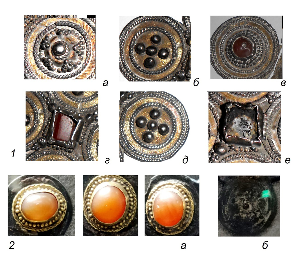 По всей видимости, первоначально был выложен филигранный декор, затем – зерневой (так как зернь подчинена филигранным элементам, а отдельные гранулы заходят на филигранные проволочки или располагаются на их поверхности). На последних этапах изготовления проводились операция нанесения позолоты на фон изделия и закрепление вставок в каст. Позолота была нанесена способом амальгамирования (рис. 2, 1), а закрепление вставок в касты производилось с помощью сжатия его углов и неглубокого заваливания его краев (рис. 2, 1 в, г, е). Вставки в изделия выполнялись из стеклянных фрагментов или целых и расколотых бус из сердолика (рис. 2, 1 в, г).