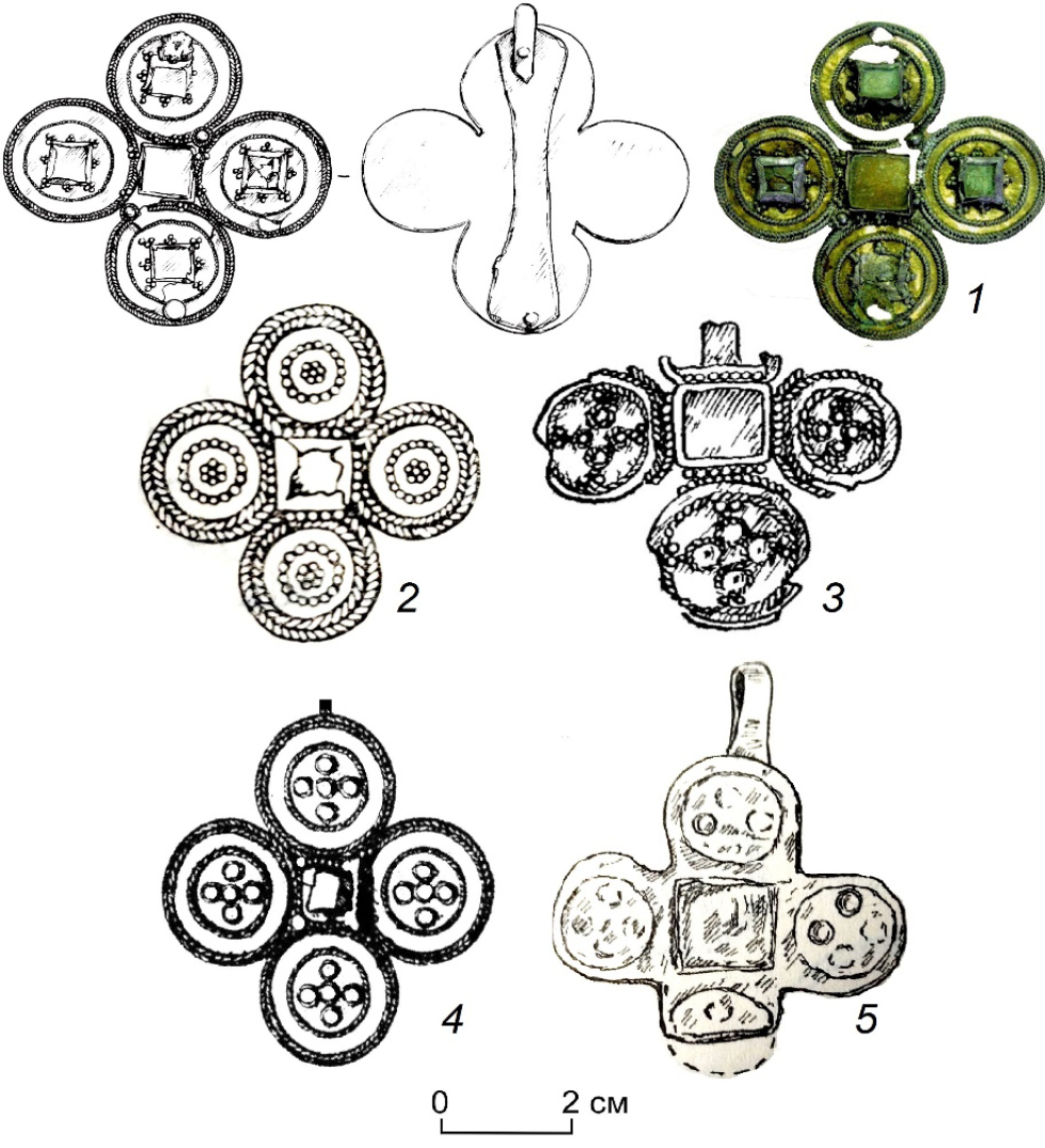 Figure 3. Grain-filigree cross-shaped pendants. Analogies. Photos: I.Yu. Pastushenko. Trace drawings: I.Yu. Pastushenko, E.A. Savelyeva, G.A. Arkhipov, Yu.A. Podosenova, A.G. Ivanov. 1 – the Kishert burial ground, 2 – the Kokpomyag burial ground; 3 – the Pochinkovo burial ground; 4 – Novgorod, 5 – the Pecheshur burial ground.
