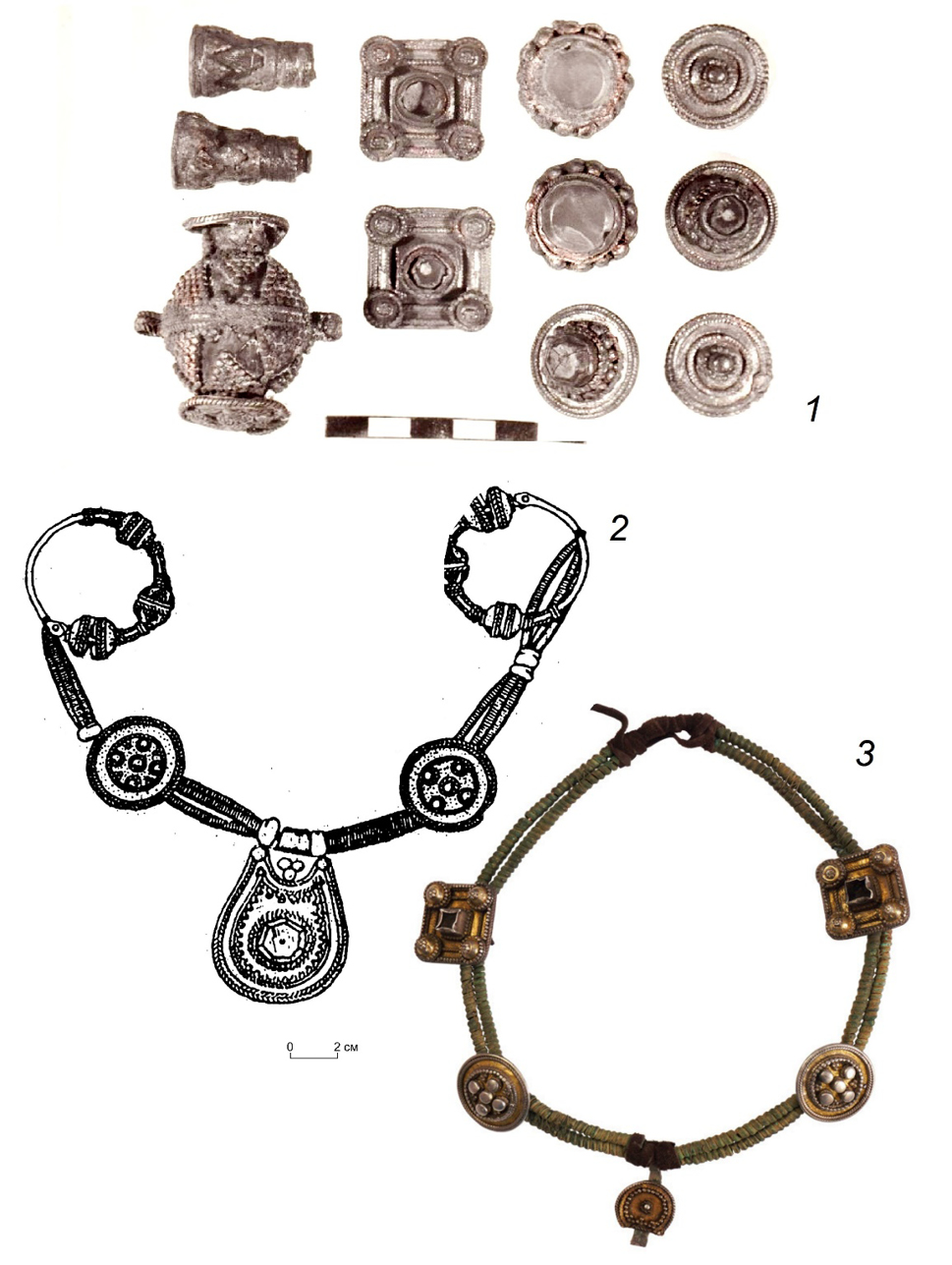 Рисунок 4. Вильгортский клад и женские наборные украшения с зерно-филигранными изделиями. 1 – Вильгортский клад (фото из архива Пермского краевого музея, номер по Госкаталогу 37203009, инв.номер А/АА-6631); 2 – Ыджыдъельский могильник, очелье (по Э.А. Савельевой); 3 – Пермский край, шейно-нагрудное украшение (фото из архива Ю.А. Подосеновой).
