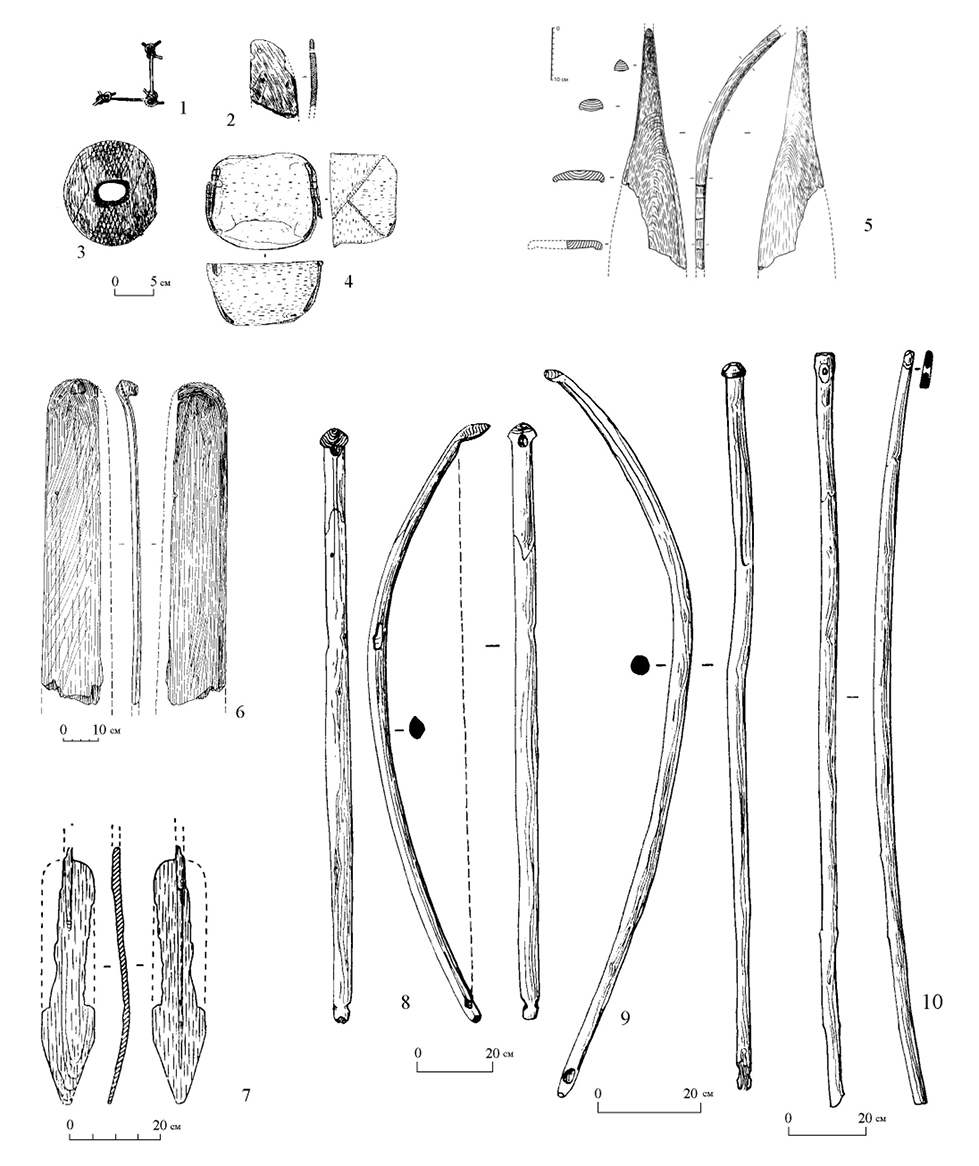 Figure 2. Vis 1 peatbog. Items made of grass (1), bark (2), birch bark (4), and wood (3, 5–10). 1 – a fishing net fragment; 2 – a fishing net float; 3 – a disk of a pole used to drive fish into the nets; 4 – a box; 5 – fragments of Vis type ski; 6 – a sledge runner; 7 – a paddle; 8–10 – bows. According to G.M. Burov.