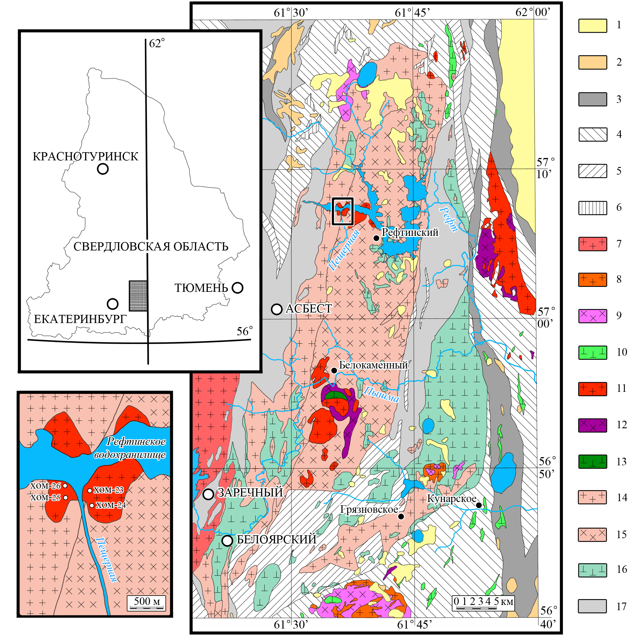 Рисунок 1. Геологическая карта Рефтинского массива (по [3] с уточнениями авторов). Условные обозначения: 1 – осадочные породы палеогенового возраста (₽1-3,); 2 – мелового возраста (K1-2); 3 – раннекаменноугольного возраста (С1); 4 – девонские вулканогенные и вулканогенно-осадочные толщи (D1-3); 5 – вулканогенные толщи ордовикского возраста (βλO3); 6 – риолиты пермского урукульско-покровского гипабиссального риолит-трахириолитового комплекса (P1); 7 – гранитоиды каменского гранит-гранодиоритового комплекса (γС2-3); 8–10 – плутонические породы некрасовского комплекса: 8 – гранитоиды (γС1), 9 – диориты (δС1), 10 – габбро (νС1); 11–13 – девонские интрузии: 11 – гранитоиды (γD2), 12 – диориты (δD1), 13 – габбро (νD1); 14–16 – рефтинский комплекс: 14 – плагиограниты (ργS2), 15 – кварцевые диориты и тоналиты (qδS1), 16 – габбро (νS1); 17 – породы офиолитовой ассоциации, алапаевский дунит-гарцбургит-габбровый комплекс (V).