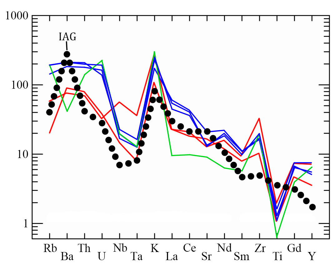 Рисунок 5. Нормированное по хондриту [21] распределение редких и рассеянных элементов в гранитоидах Хомутинского массива и Пещернинского штока, сравнение с гранитами островных дуг (IAG) [28]. Условные обозначения: см. рис. 4.