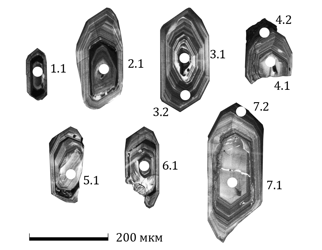 Катодолюминесцентные снимки демонстрируют отчетливо выраженное ритмично-зональное строение зерен. Некоторые из них имеют черную незональную кайму. Измерения изотопного состава преимущественно выполнены в центральных частях кристаллов, в некоторых зернах дополнительно проведены замеры и во внешних зонах.